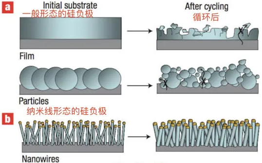 但硅有一个致命弱点——充放电过程中体积膨胀非常严重,锂离子进入时膨胀,膨胀率最高达300%(碳的膨胀率只有16%)[4],锂离子离开后又收缩,一膨一缩之间,材料就会破碎和粉化。在实际使用中,会导致电池衰减速度极快,充电循环次数极低。