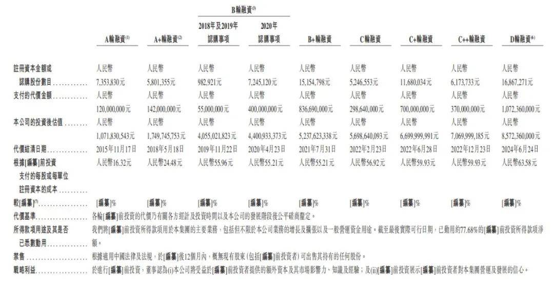 值得注意的是,公司D轮获得融资资金时间为2024年6月24日(即在递表前4天),完成D轮10.72亿元融资后,公司估值已经达到85.72亿元,较A轮投后估值的10.72亿元,涨幅8倍左右。