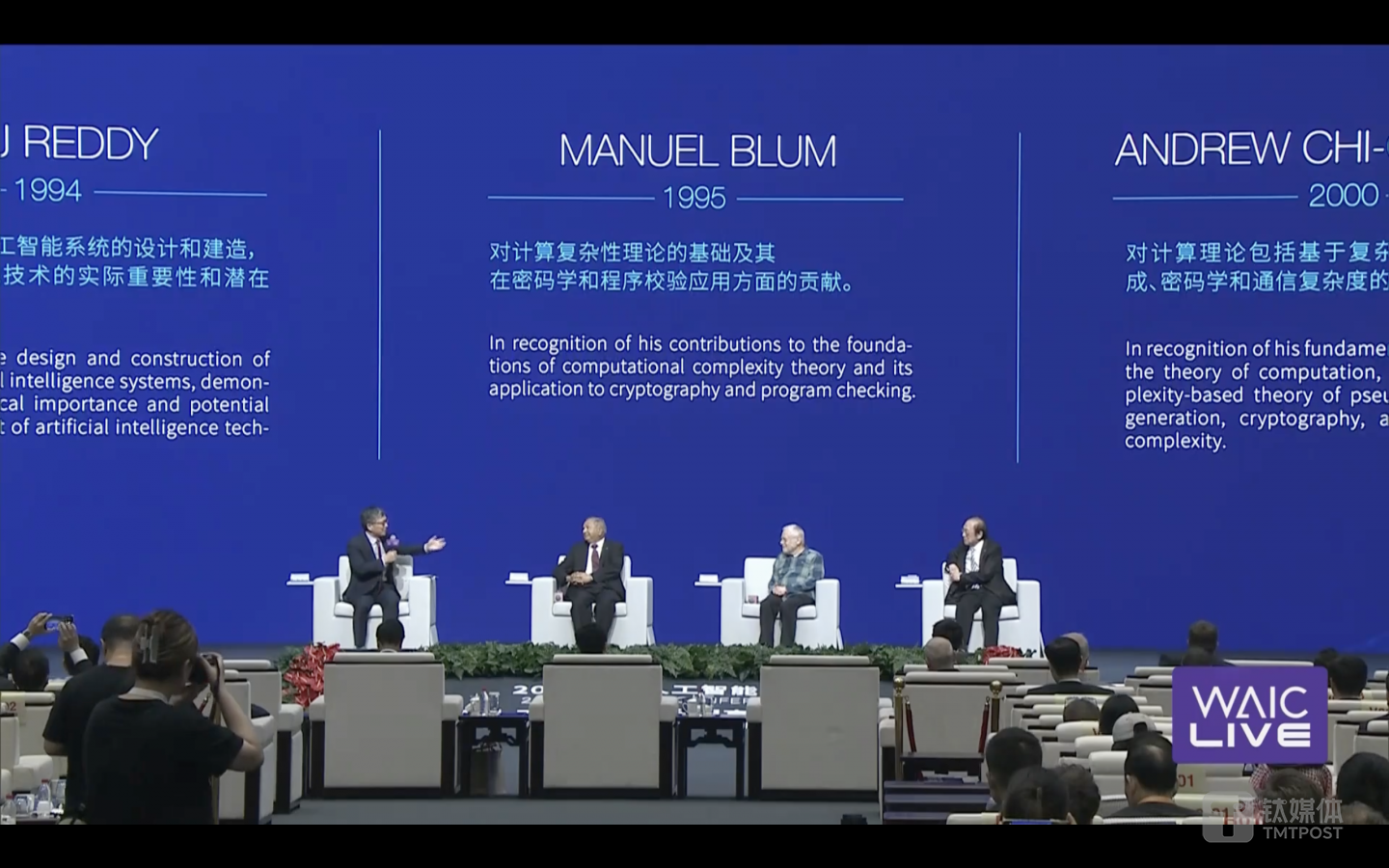 7月4日举行的WAIC 2024全体会议的全球治理图灵圆桌环节,沈向洋对话三位图灵奖得主罗杰·瑞迪(Raj Reddy)、曼纽尔·布卢姆(Manuel Blum)、姚期智,讨论这个时代的AI治理挑战与机遇并存。