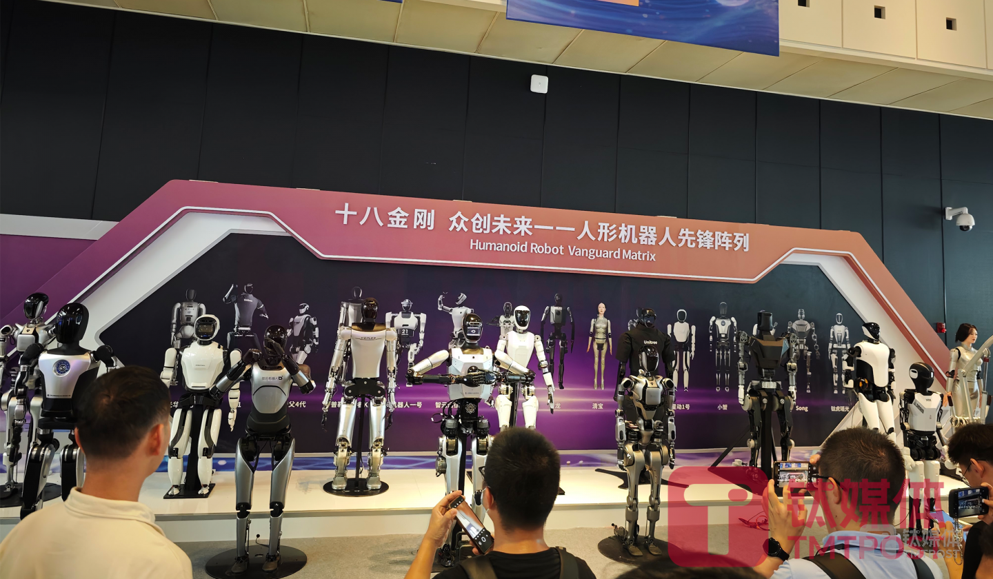 在外侧的H1展位上,人形机器人先锋阵列展位面前,挤满了人围观这“十八金刚”——由十八位人形机器人组成,它们各自都有一个代号,分别是青龙、X02-LITE、清宝机器人、智元远征A2、傅利叶GR-1、电科机器人一号、星动1号、开普勒先行者K1、小蟹、夸父4代、XR-4、H1、Song、光华一号、钛虎瑶光。