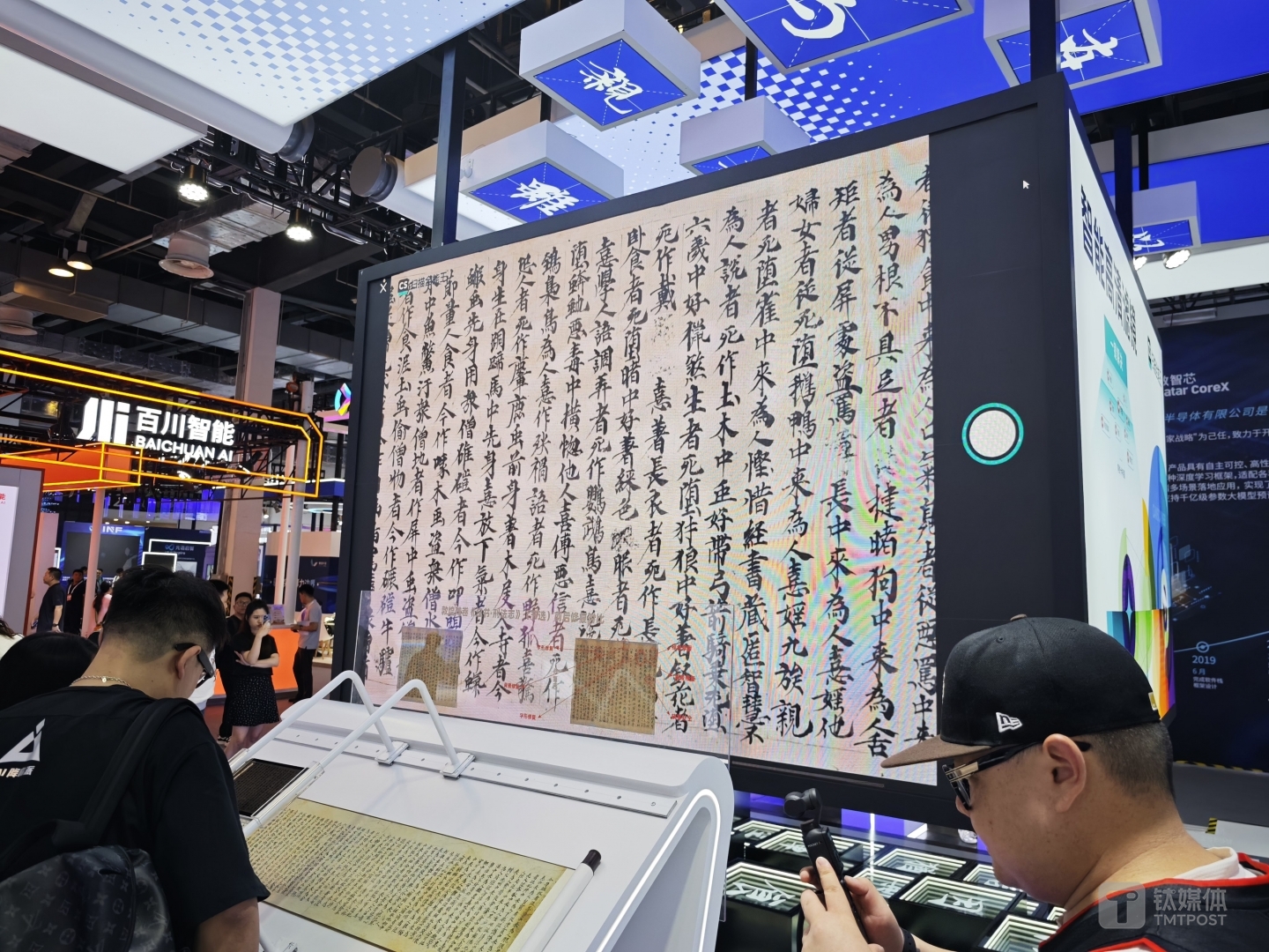 国内 AI 公司合合信息在展台上,重点展示旗下扫描全能王携手华南理工大学团队,将AIGC技术应用于敦煌遗书残卷的图像数字化修复上,共同打造了AI古籍修复模型。