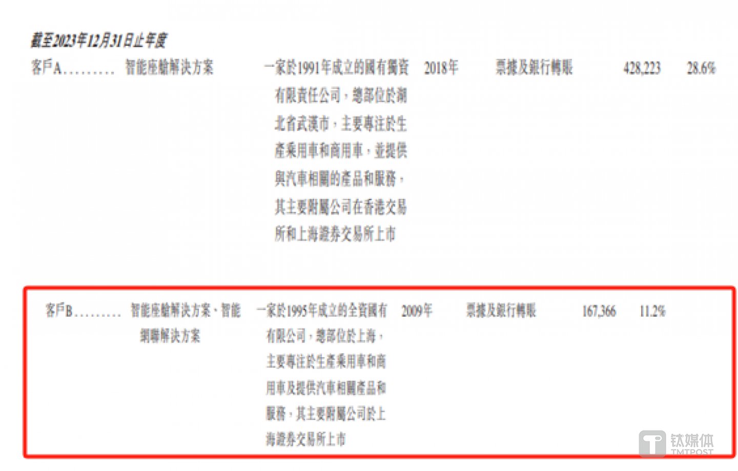 钛媒体APP注意到,博泰车2023年来自前五大客户营收的占比下滑,或由于客户“砍单”所致。据悉,报告期内,客户B始终是博泰车的第二大客户,博泰车来自客户B的营业收入分别为2.45亿元、3.1亿元、1.67亿元,可见2023年,客户B贡献了营收同比下滑了46.13%。