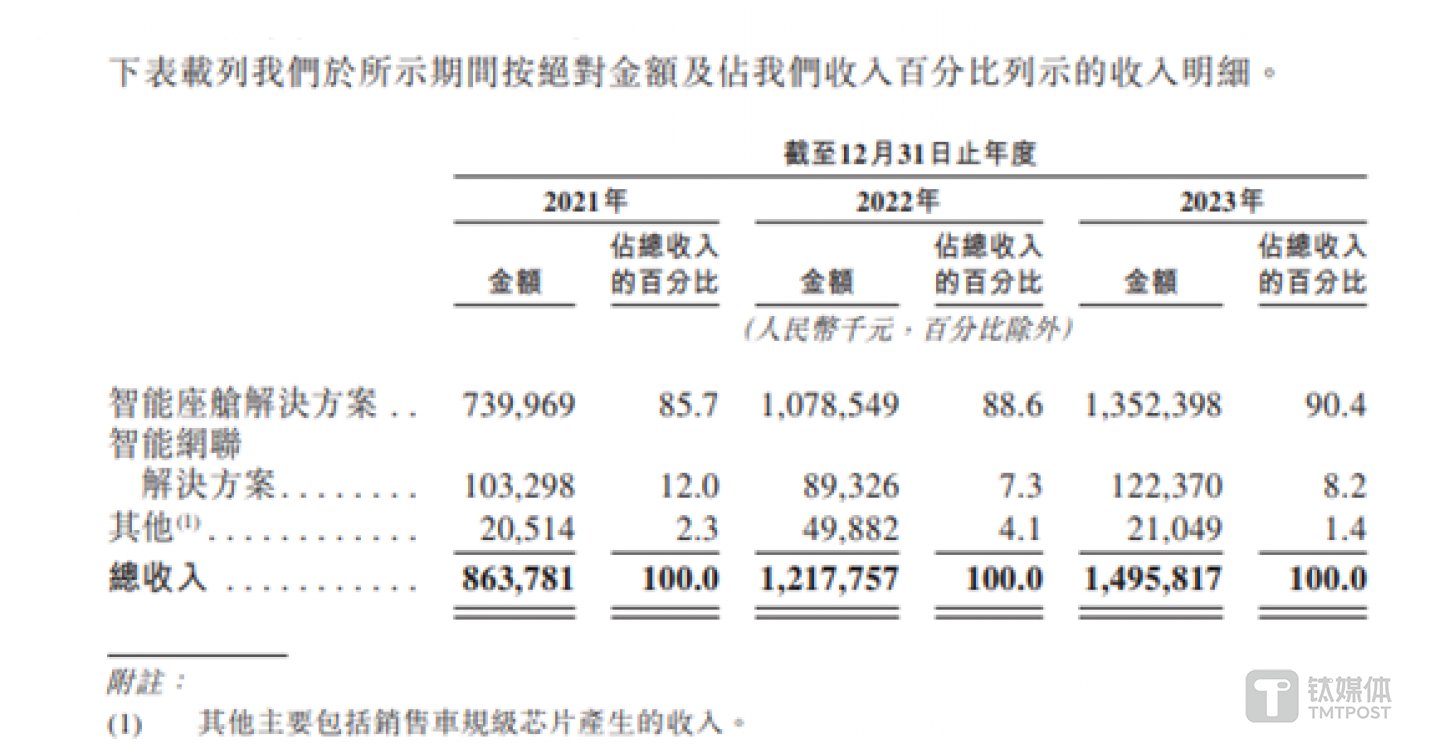 其中智能座舱解决方案产生的营业收入分别为7.4亿元、10.79亿元、13.52亿元,分别占当期营业收入的85.7%、88.6%、90.4%。得益于智能座舱解决方案的发展,博泰车的营收才能持续增长。