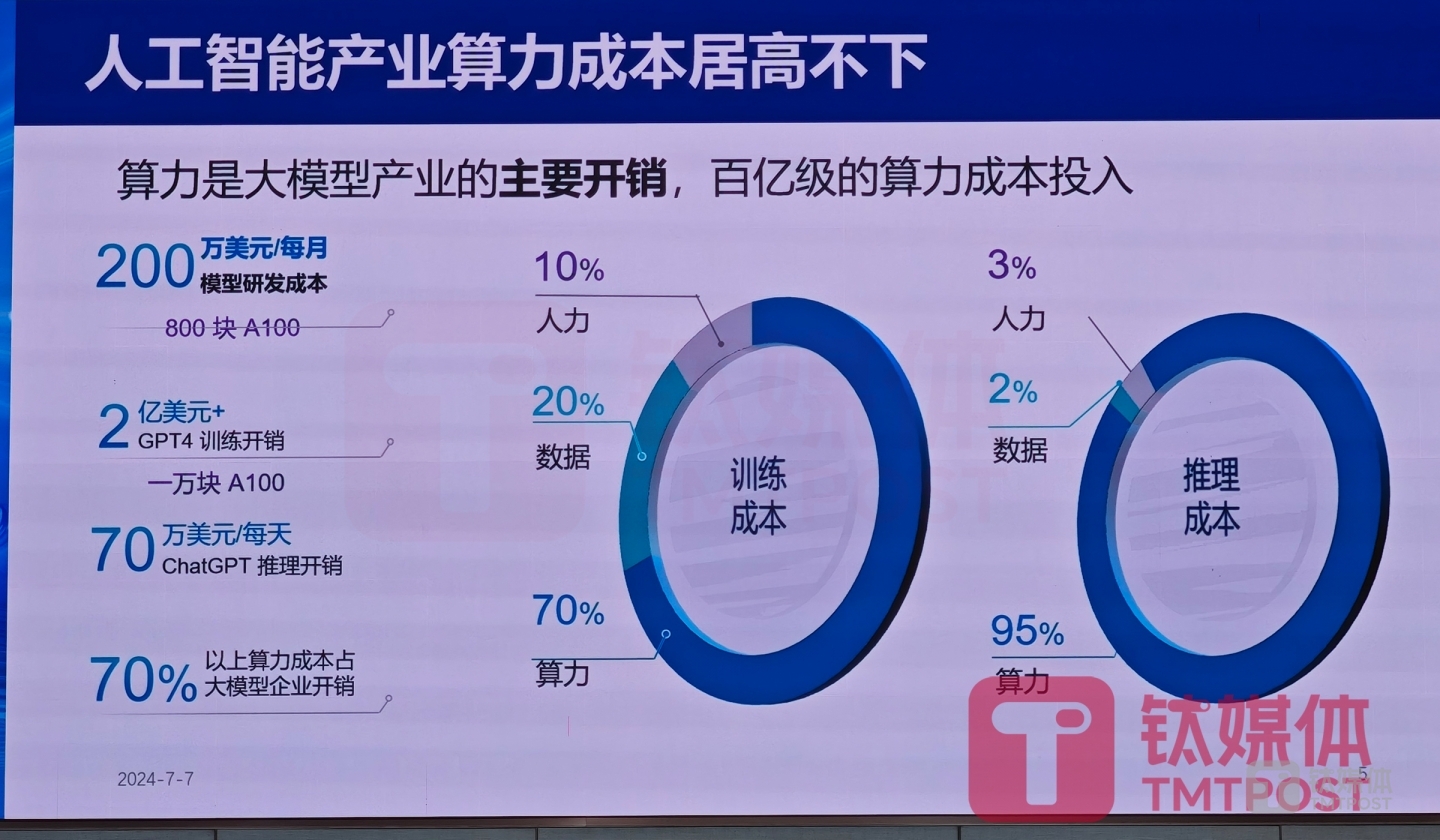 郑纬民提到,算力很贵,成本居高不下,如GPT-4用了800块英伟达A100,每月模型研发成本200万美元,其中,1万块A100的算力训练开销达2亿美元,ChatGPT每天推理开销达70万美元。而在大模型企业模型训练成本中,算力占70%,而在模型推理成本中,95%都是算力。