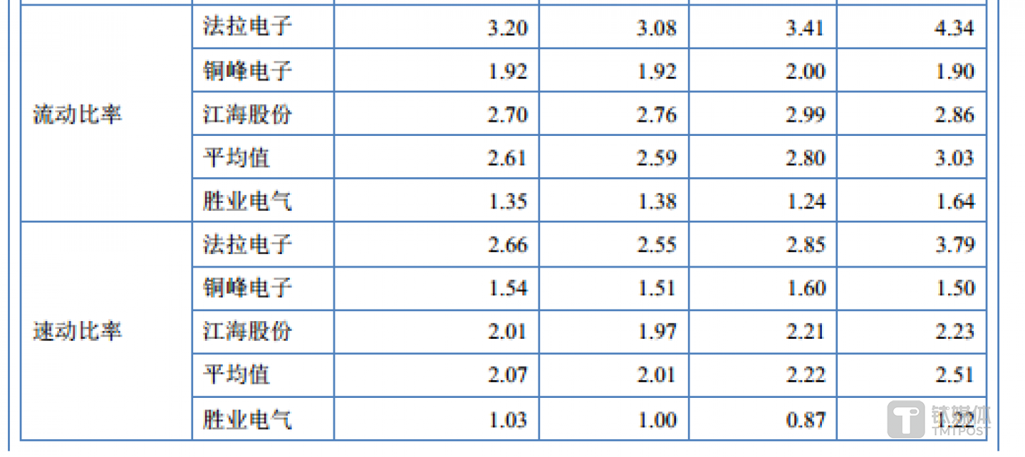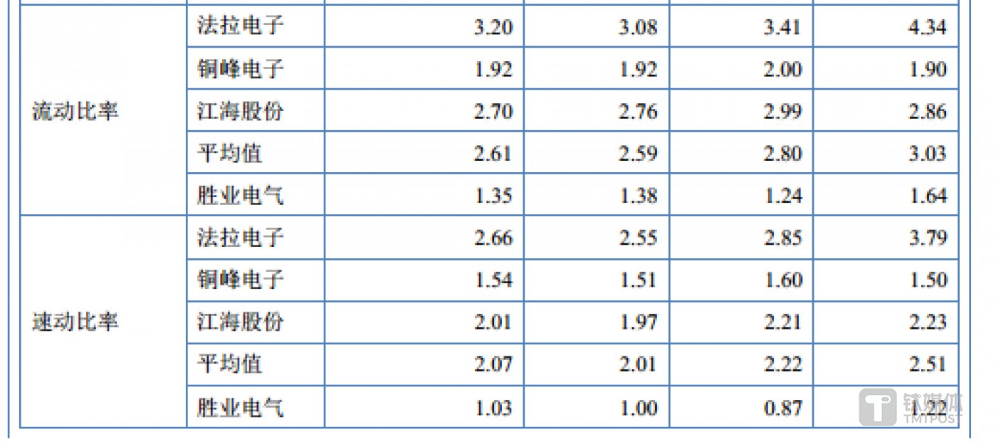 钛媒体APP注意到,胜业电气的短期偿债能力始终弱于同行。报告期内,胜业电气的流动比率分别为1.64、1.24、1.38、1.36,同行可比公司平均值分别为3.03、2.8、2.59、2.61;速动比率分别为1.22、0.87、1、1.03,同行可比公司平均值分别为2.51、2.22、2.01、2.07,无论是流动比率还是速动比率,胜业电气均远低于同行均值。