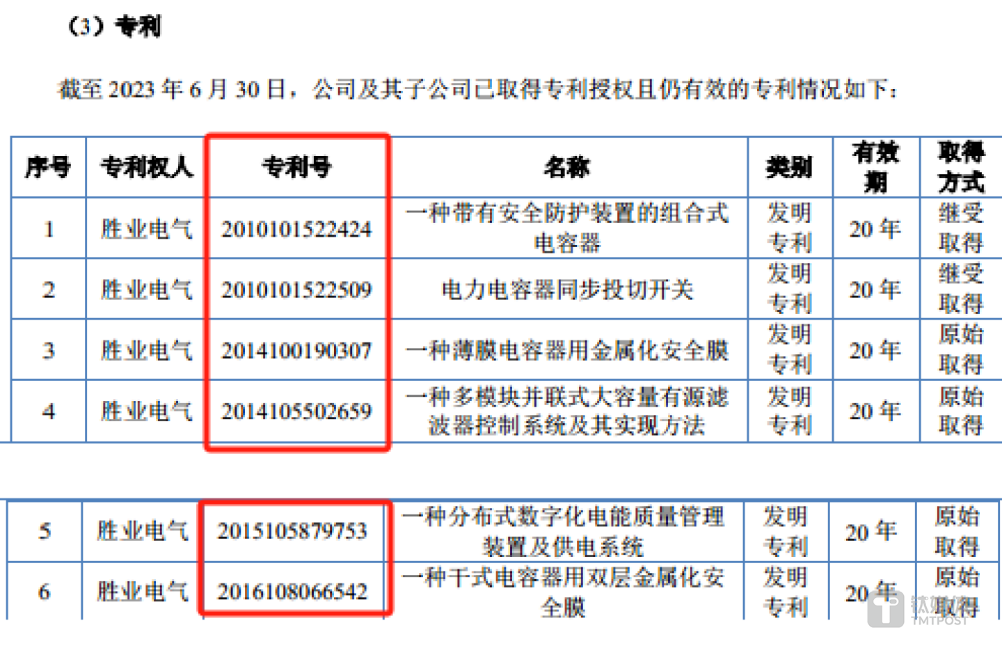 值得一提的是,截至2023年6月末,胜业电气共拥有6项发明专利,其中2项为继受取得,4项为原始取得,具体情况如下: