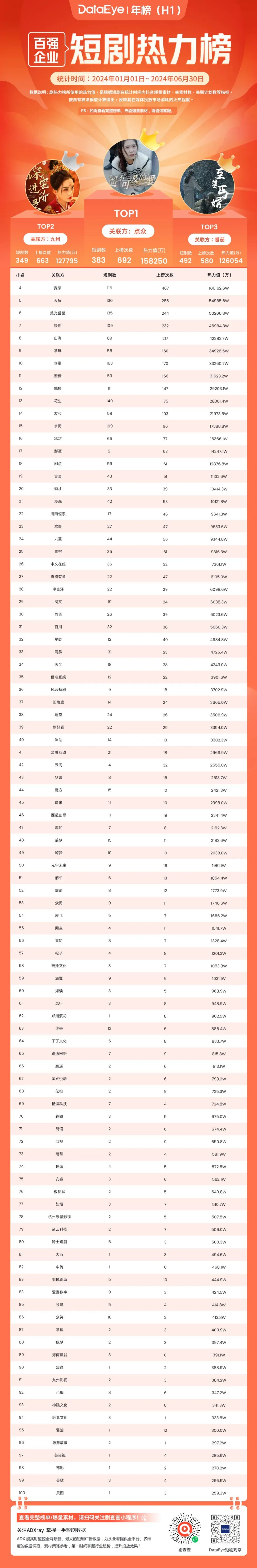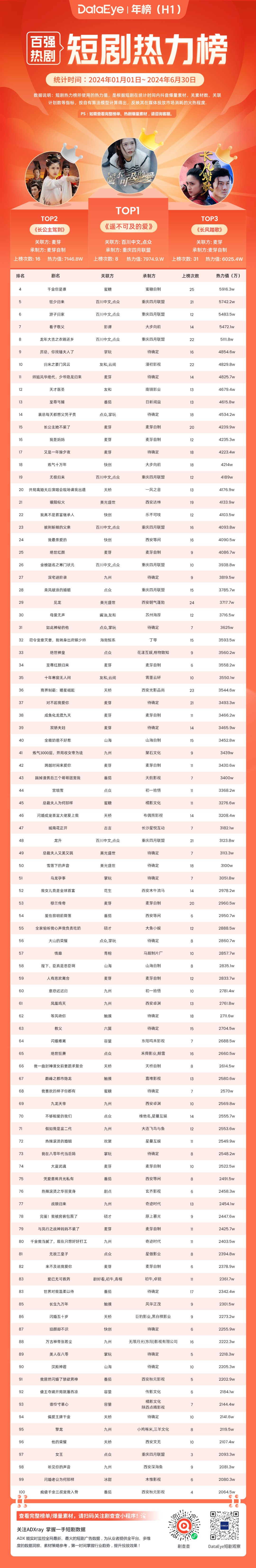 2024H1百强热剧榜:热力值总额超33亿,《遥不可及的爱》登顶,麦芽、点众、九州表现突出。