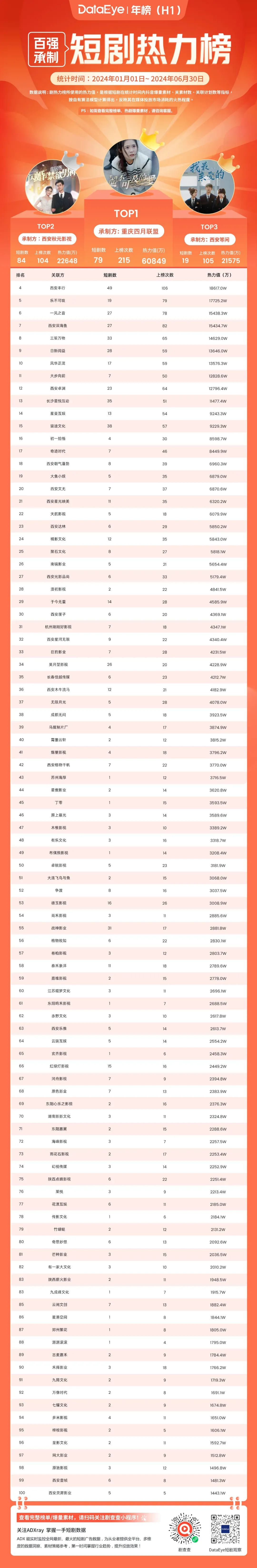 2024H1百强承制榜:热力值总额近55亿。重庆四月联盟登顶,热力值超6亿,西安秋元影视与西安等闲热力值均超2亿。