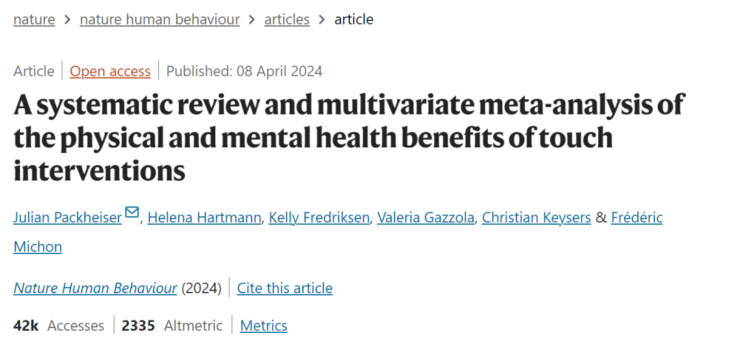▷Packheiser, J., Hartmann, H., Fredriksen, K. et al. A systematic review and multivariate meta-analysis of the physical and mental health benefits of touch interventions. Nat Hum Behav (2024). https://doi.org/10.1038/s41562-024-01841-8