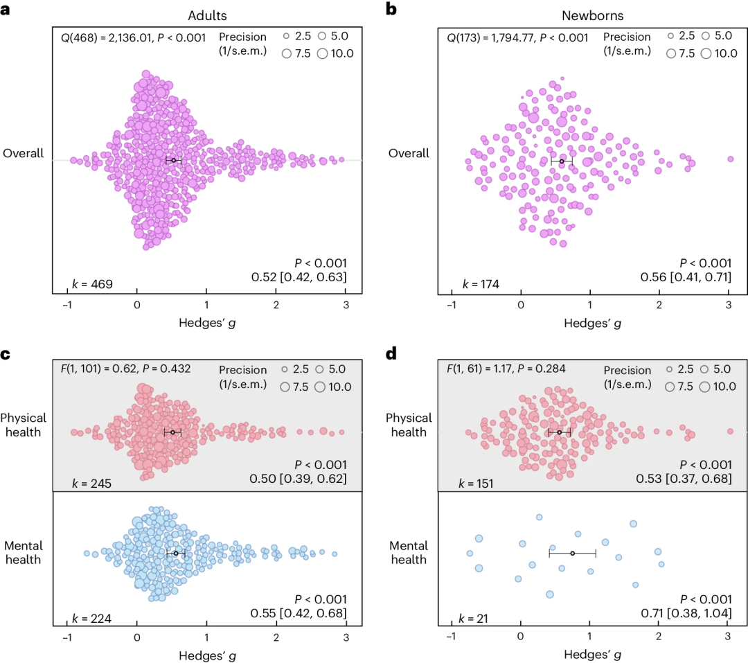 在今年发表于Nature Human Behavior的一篇系统性综述和元分析中[1],作者对212项关于触摸的研究进行了分析,比较了不同的触摸类型、频率和时长、被触摸者的健康状况和年龄等因素对触摸带来的健康效果的影响。分析结果显示,总体而言触摸对健康有益,而许多因素都会影响触摸的效果。这些发现也为未来的触摸研究、机器人研究等带来了一些启发。