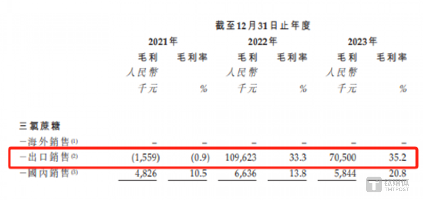 最后,拉长时间看,新琪安三氯蔗糖的出口销售毛利率也较为神奇。报告期内,新琪安三氯蔗糖的出口销售毛利率分别为-0.9%、33.3%、35.2%,也就是说,新琪安从2021年出口亏本销售三氯蔗糖到2022年该产品的毛利率达到33.3%,仅用了一年时间。与此同时,2023年三氯蔗糖深陷还深陷价格战。从公司的申报稿中可以发现,2021年三氯蔗糖并未发生价格战,新琪安却亏本销售该产品,实在令人费解。