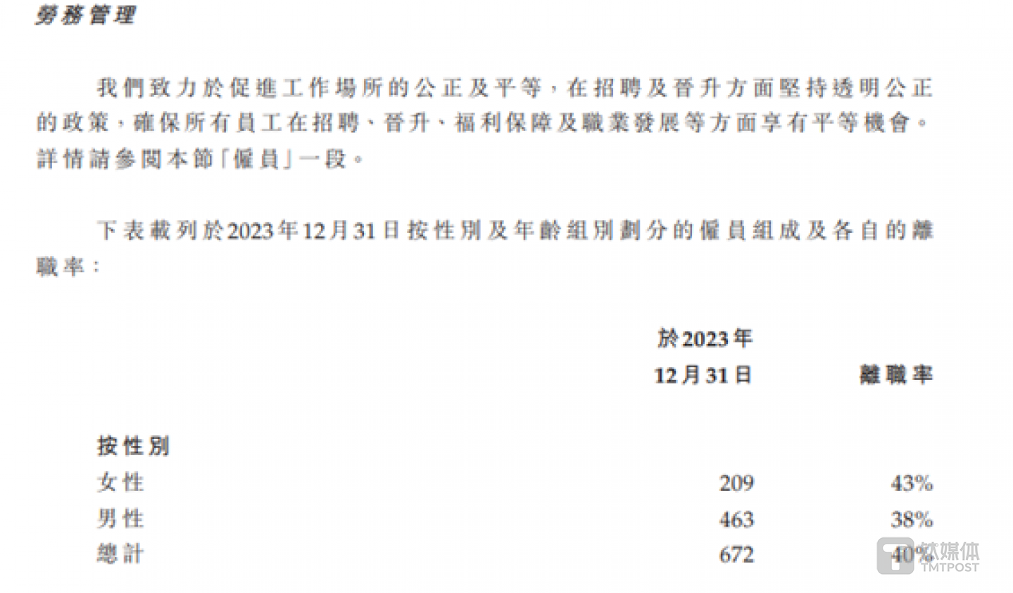 钛媒体APP注意到,新琪安的人员波动也较大。截至2023年末,新琪安共拥有672名员工,其中男女比例分别为209名、463名,离职率分别为43%、38%,具体情况如下: