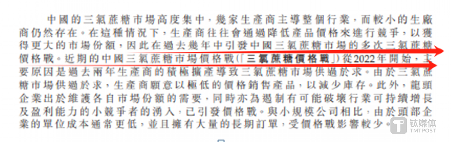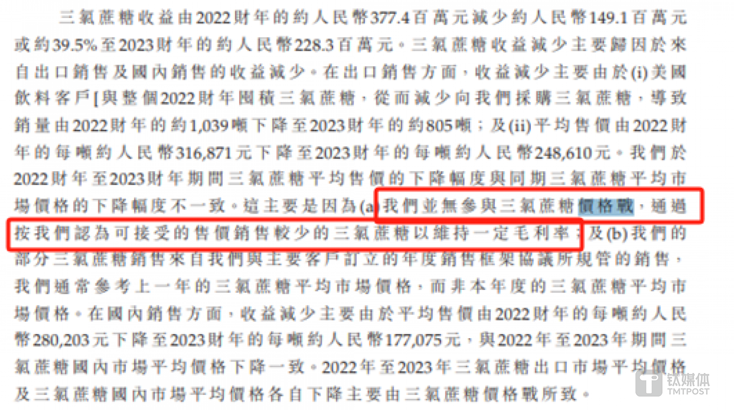 针对于创收最高的三氯蔗糖,钛媒体APP发现了三大“奇观”。首先,新琪安在申报稿中自述,中国的三氯蔗糖市场高度集中,几家生产商主导整个行业,而较小的生厂商仍然存在。在这种情况下,生产商往往会通过降低产品价格来进行竞争,以获得更大的市场份额,因此在过去几年中有多次价格战。2022年价格战再一次打响,这一次价格战的原因是三氯蔗糖市场供过于求,库存高企。