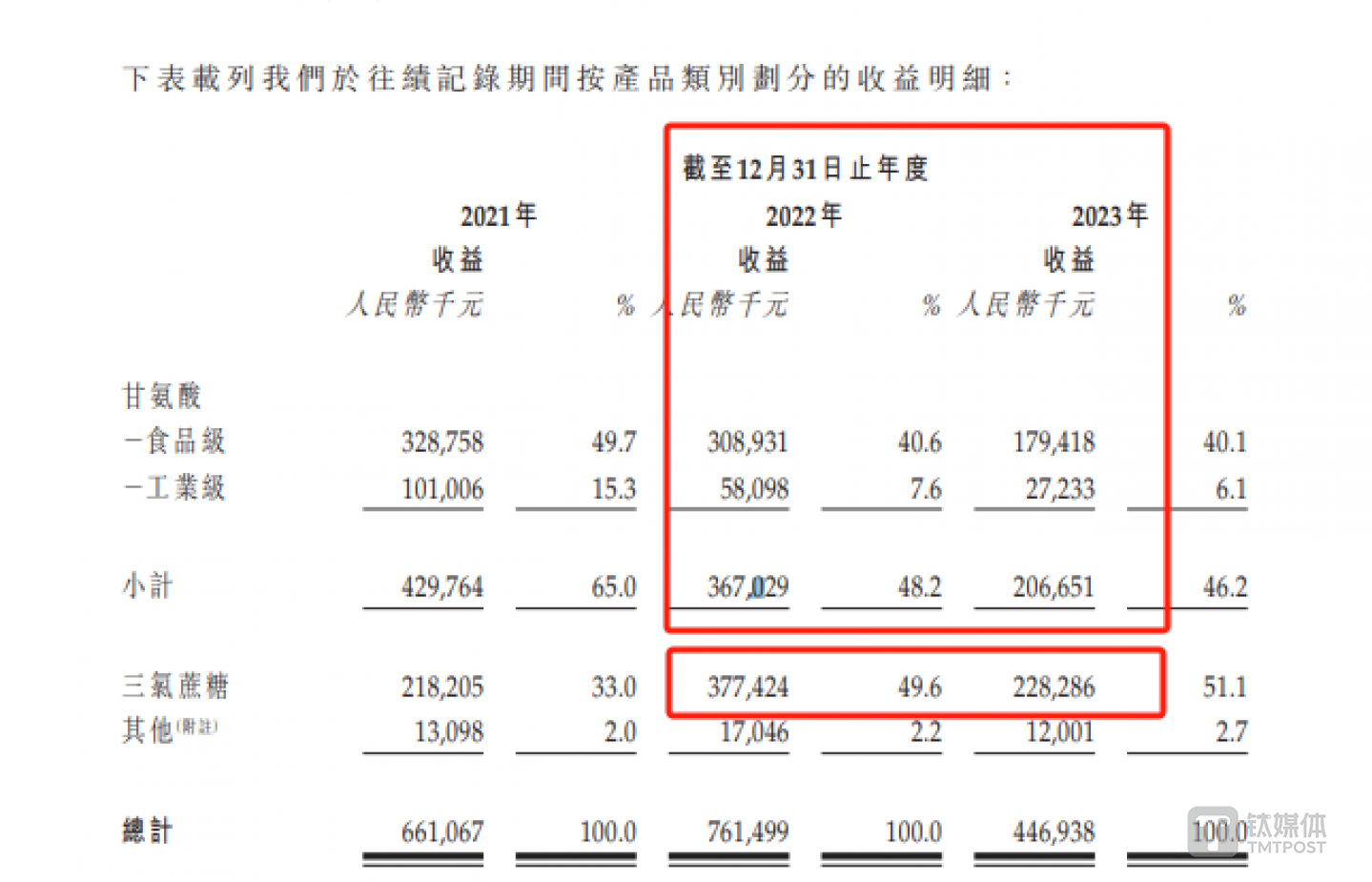 可见,由于2023年甘氨酸和三氯蔗糖的收入大幅下滑,才导致公司整体业绩“腰斩”,同时三氯蔗糖也代替甘氨酸成为公司创收最高的产品。