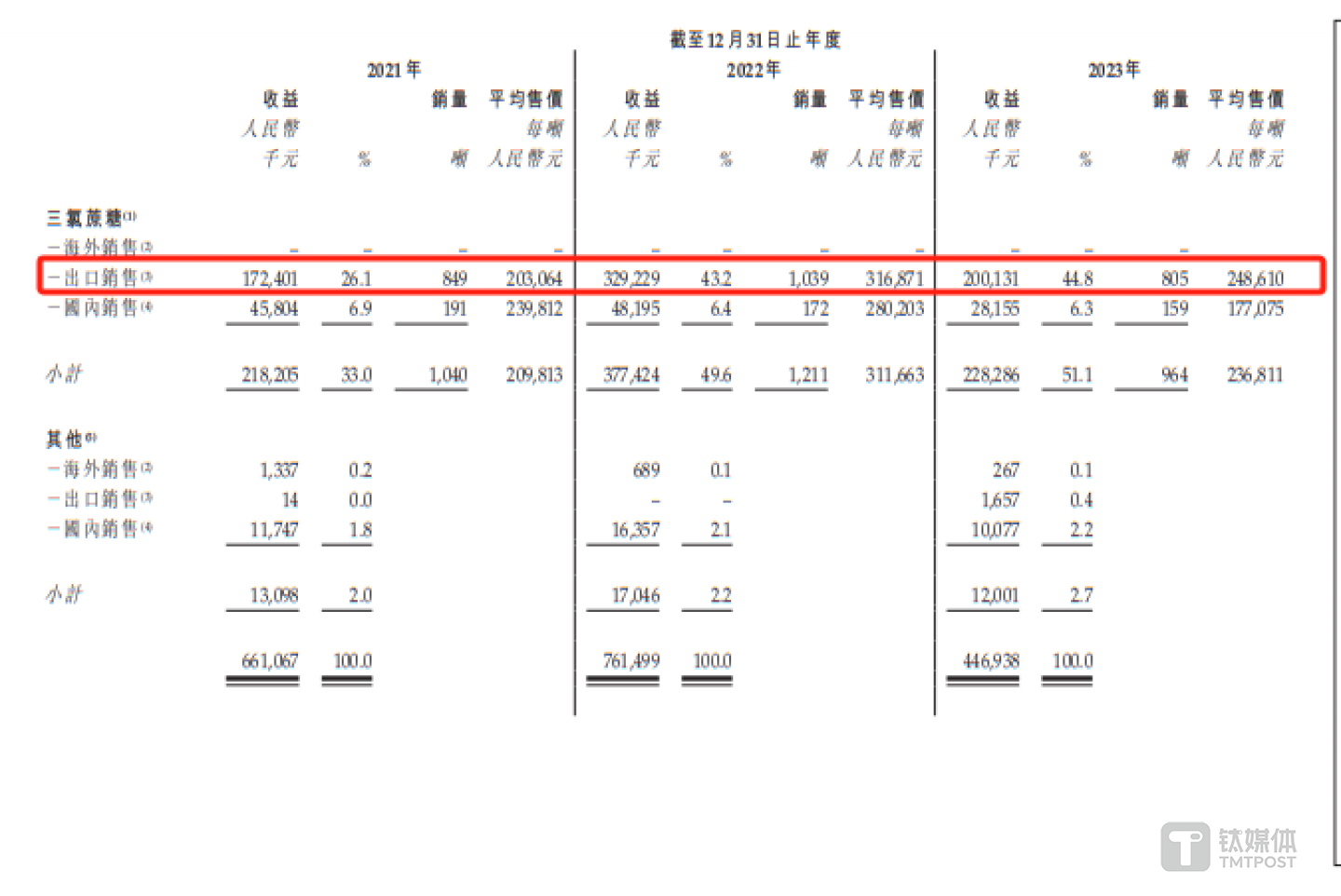 而新琪安三氯蔗糖的收入几乎全部来自出口销售,具体情况如下: