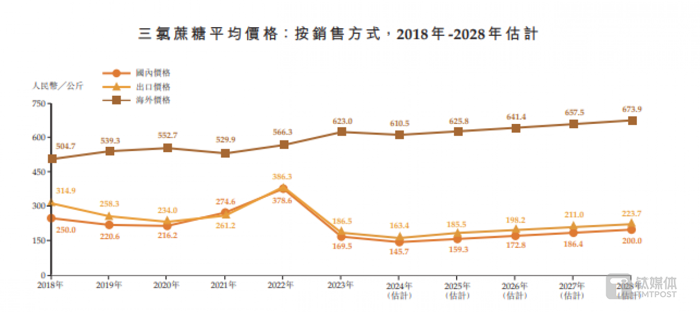 可见,深受价格战影响,三氯蔗糖的平均出口市场价格从2022年的约每公斤386.3元大幅下跌至2023年的约每公斤186.5元。