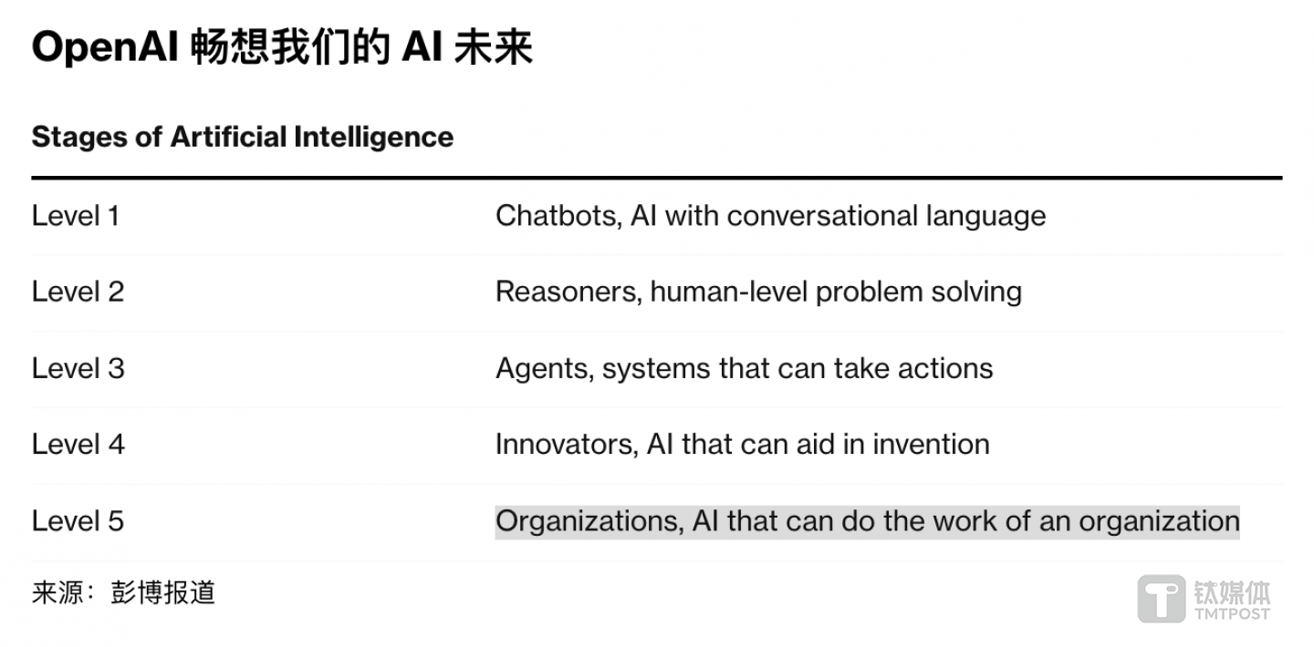 彭博报道,OpenAI公司在今晨内部员工大会上提出一套五个level等级来追踪GPT能够超越人类的 AI 技术方面的进展。
