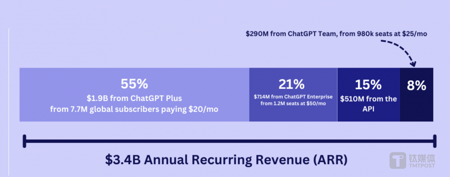 - API: 占总收入的15%,即5.10亿美元。这部分收入来自使用ChatGPT API的开发者和公司。
