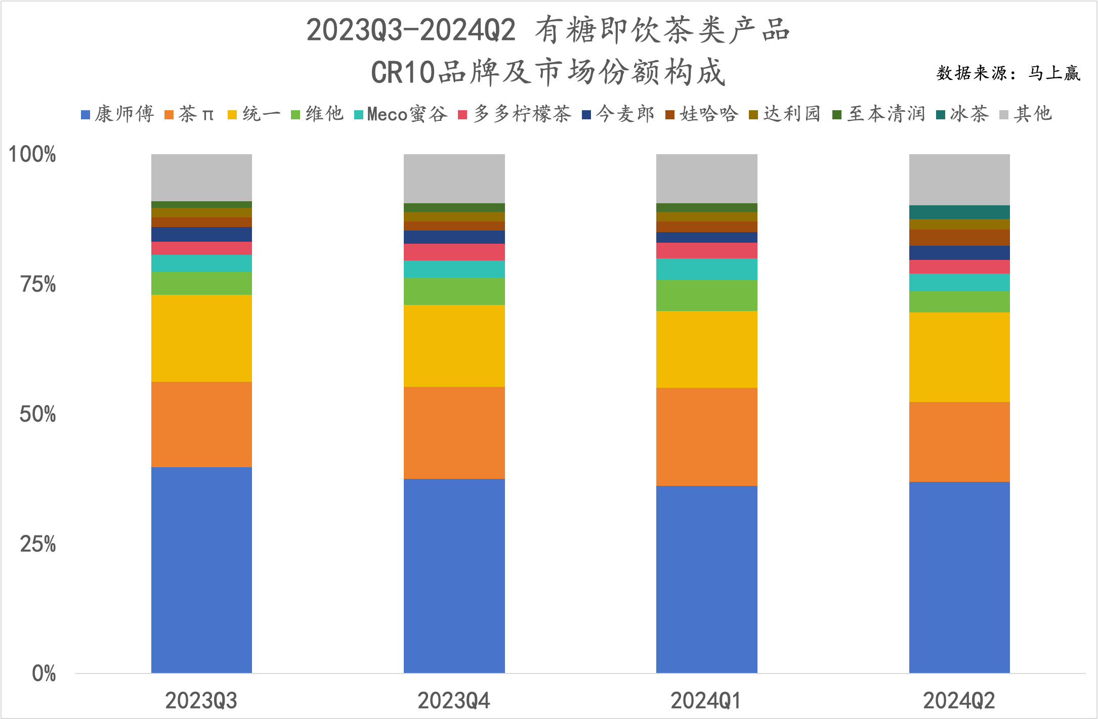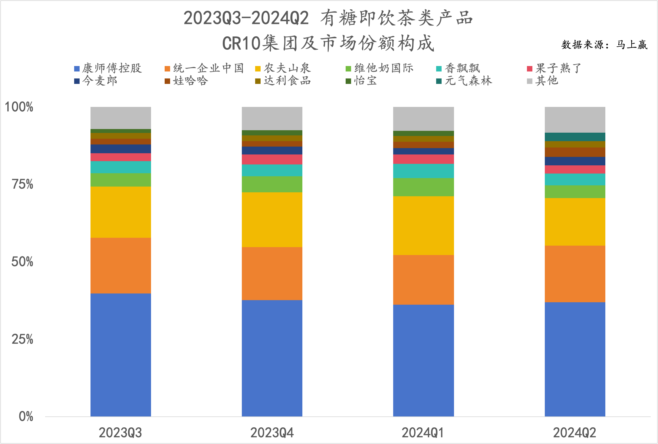 从集团与品牌来看,有糖即饮茶中,大部分属于历久弥新的传统品牌,新品牌在CR10中份额较小,也不够稳定。