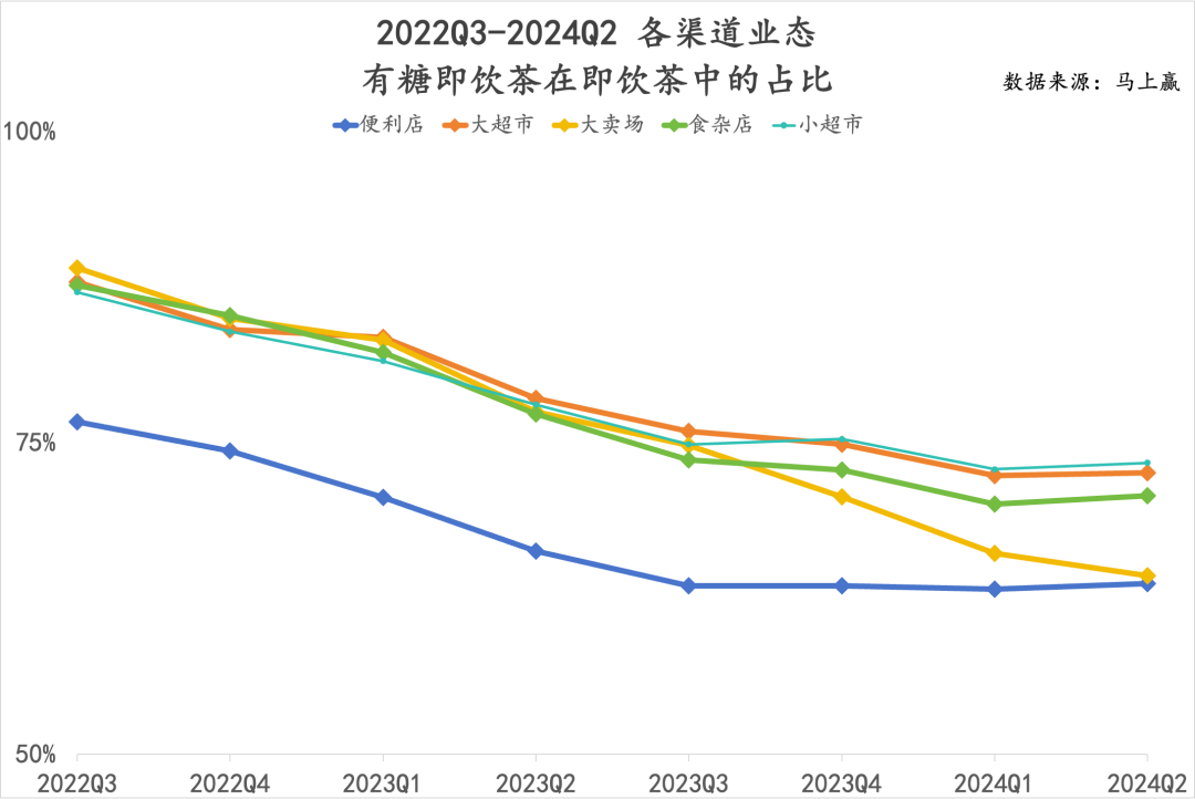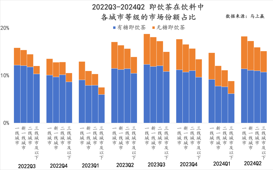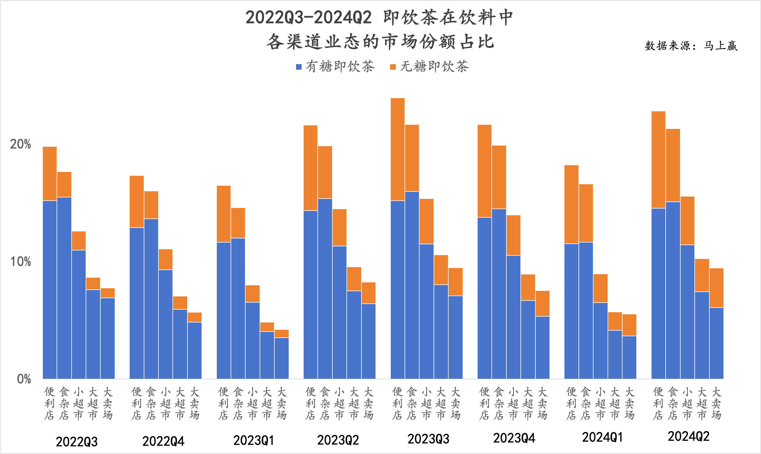 或许是与城市等级的偏好有一定相关性,在各业态、渠道中的占比情况,依然是有糖即饮茶在各渠道中占大多数,但叠加时间来看,22Q3-24Q2这一时间段内,尤其是在夏日饮料消费旺季,即饮茶中的增量主要来自于无糖即饮茶,有糖即饮茶在各个渠道中的变化都不大。