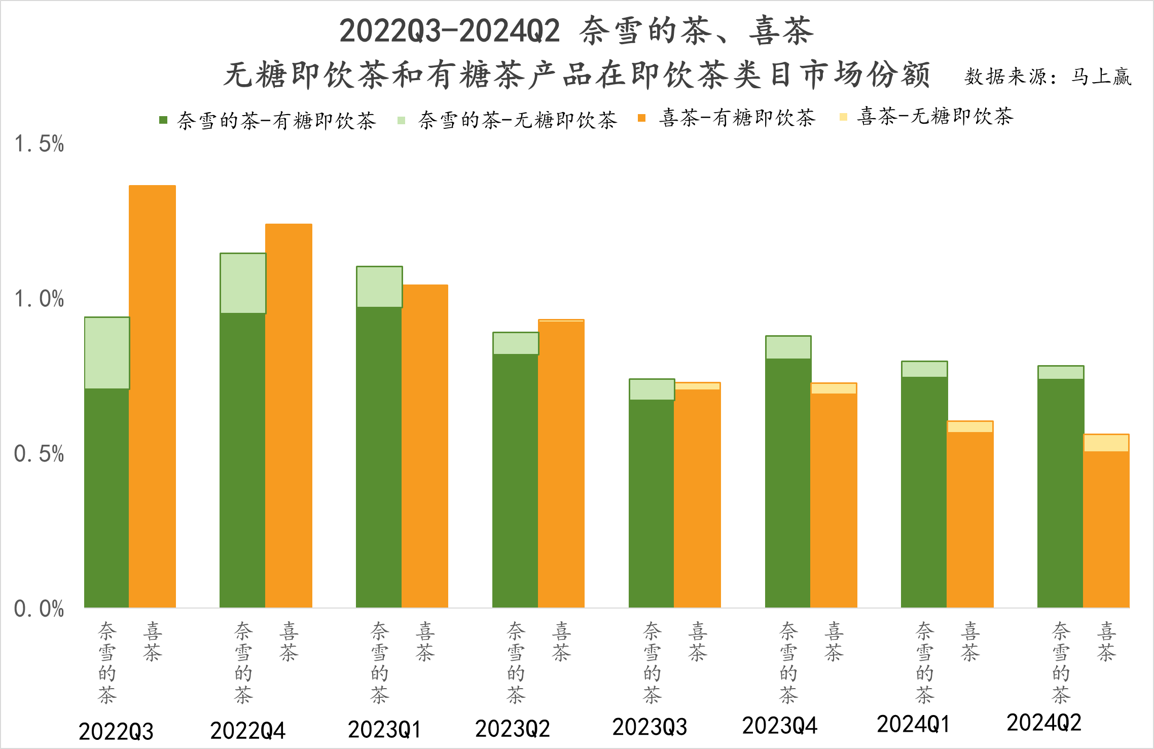基于马上赢品牌CT中的数据,可以看到,从2022Q3-2024Q2,两家的有糖+无糖即饮茶产品,在整个即饮茶类目中的市场份额各自均不足1.5%,其中奈雪的茶瓶装即饮茶产品市场份额在1%左右徘徊,喜茶则是呈现较明显的下降趋势,从22Q3的接近1.5%一路下滑到24Q2仅高于0.5%。