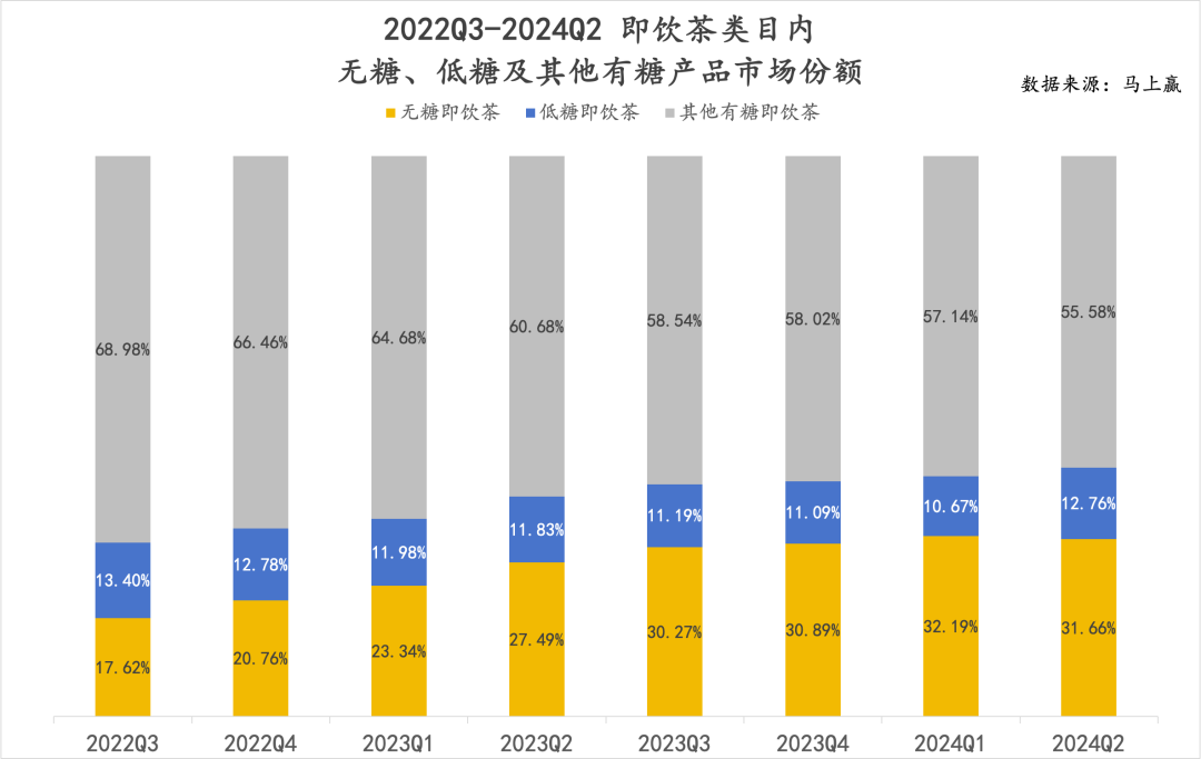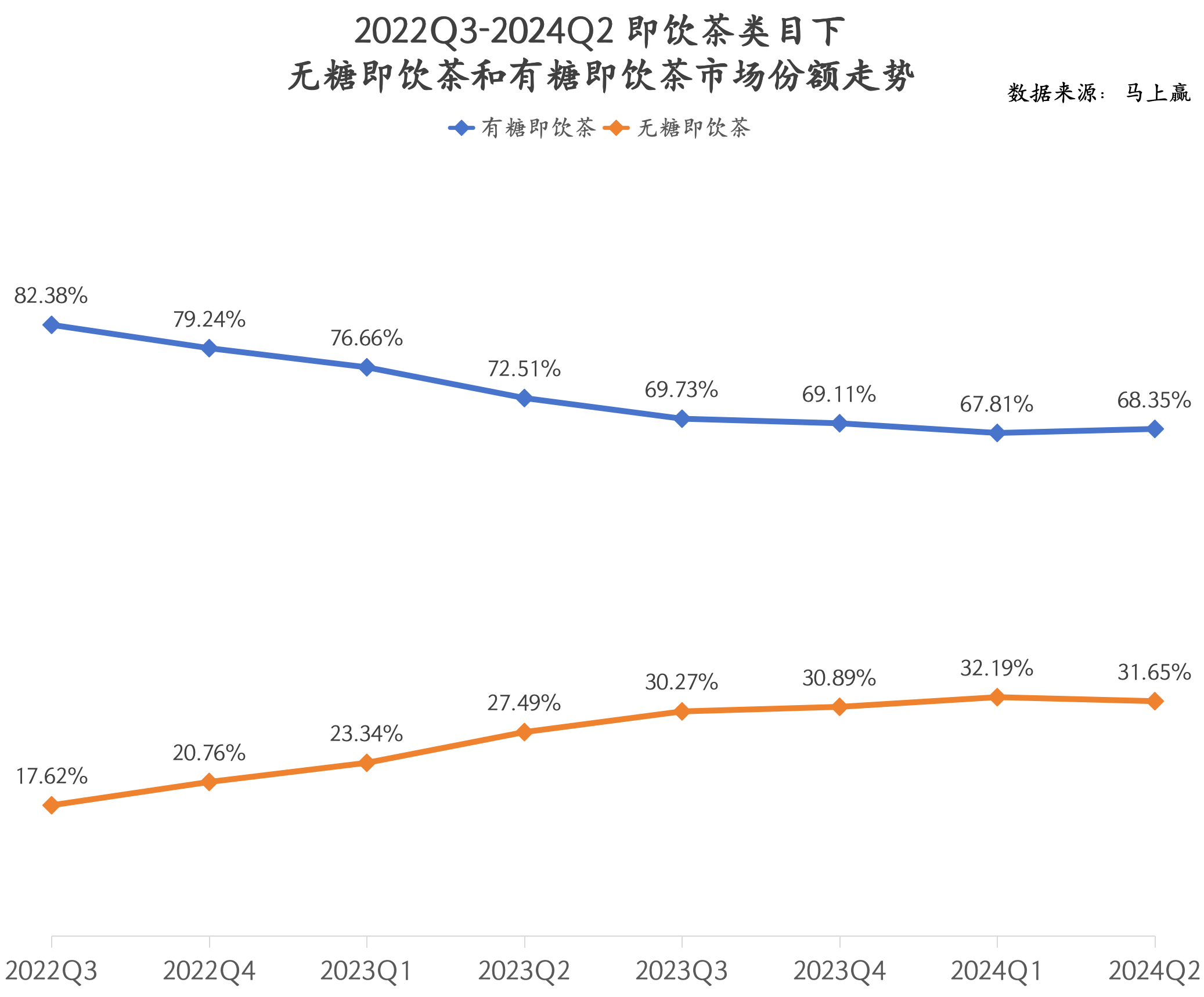 基于马上赢品牌CT中的数据可以看到,从2022Q3到2024Q2,两年的时间内,无糖即饮茶虽然占比节节攀升,但截止24Q1、24Q2依然只占有30%左右的市场份额,相比来说,有糖即饮茶虽然从高位的82%一路下滑,但截止24Q2,依然占有了即饮茶类目中近七成的市场份额----这还仅仅是在类目内的统计,没有计算即饮茶类目整体的增长情况。如果加入即饮茶类目本身的规模增长来看,不论是有糖即饮茶,还是无糖即饮茶,在饮料中的比重都在近年来持续增长,无糖即饮茶过去规模小,增速就更快;有糖即饮茶规模更大,增速稍慢些。