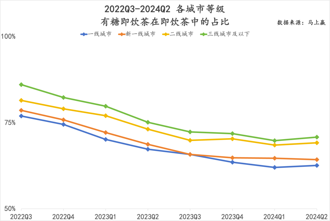 我们通过即饮茶类目内无糖/有糖产品的占比,或许可以更好的观察到有糖即饮茶的低线城市偏好性,可以看到,有糖即饮茶在即饮茶类目中的市场份额占比,在各城市等级中呈现明显的负相关关系:城市等级越低,有糖即饮茶占比越高。