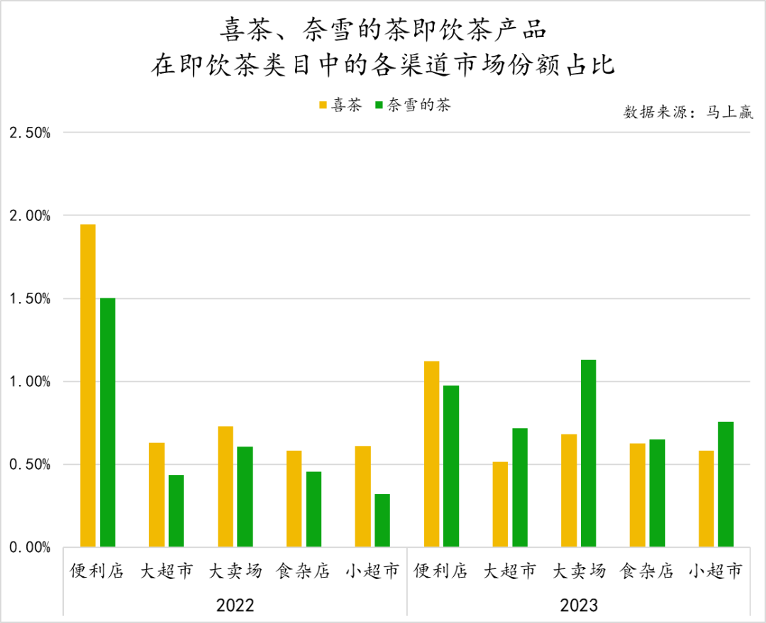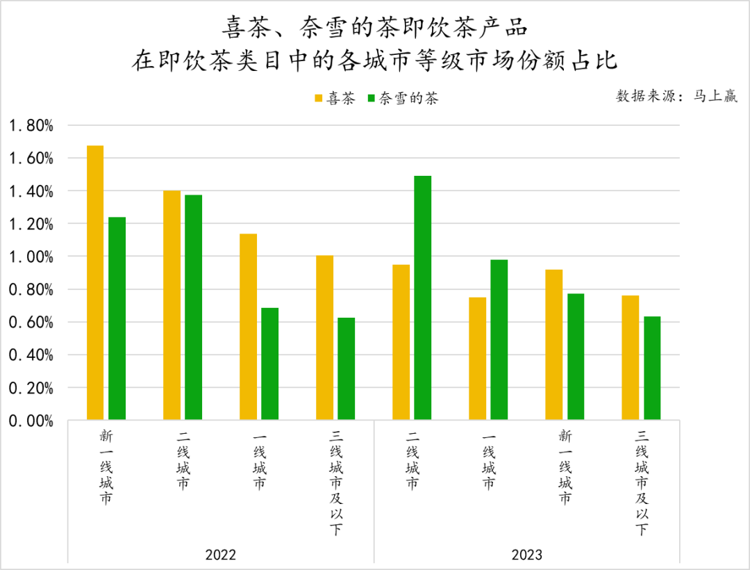 不论是城市等级还是业态的情况,这一现状或许与两个品牌的门店业务在各城市等级中的渗透率有很强的相关性,但对于瓶装有糖即饮茶这一类型产品的城市等级、业态偏好来说,尤其是这一类产品的增量市场来说,两个品牌均没有太多的优势。