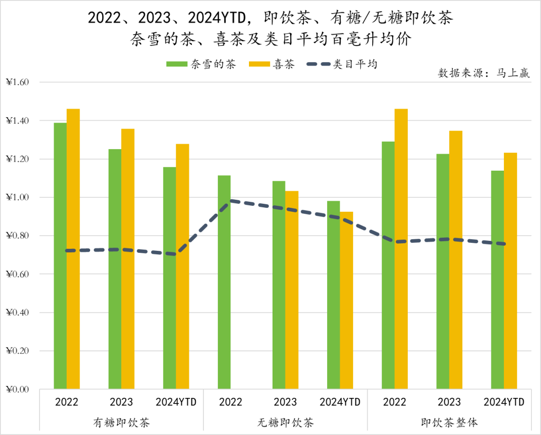 基于马上赢品牌CT中的数据,可以看到,在有糖即饮茶和即饮茶整体中,奈雪的茶、喜茶的百毫升均价显著高于类目平均水平,2022年时在有糖即饮茶中近乎高于类目平均百毫升均价接近一倍。虽然从2022-2024YTD,两家产品的百毫升均价都处在下降通道中,但依然比类目平均水平高出不少。
