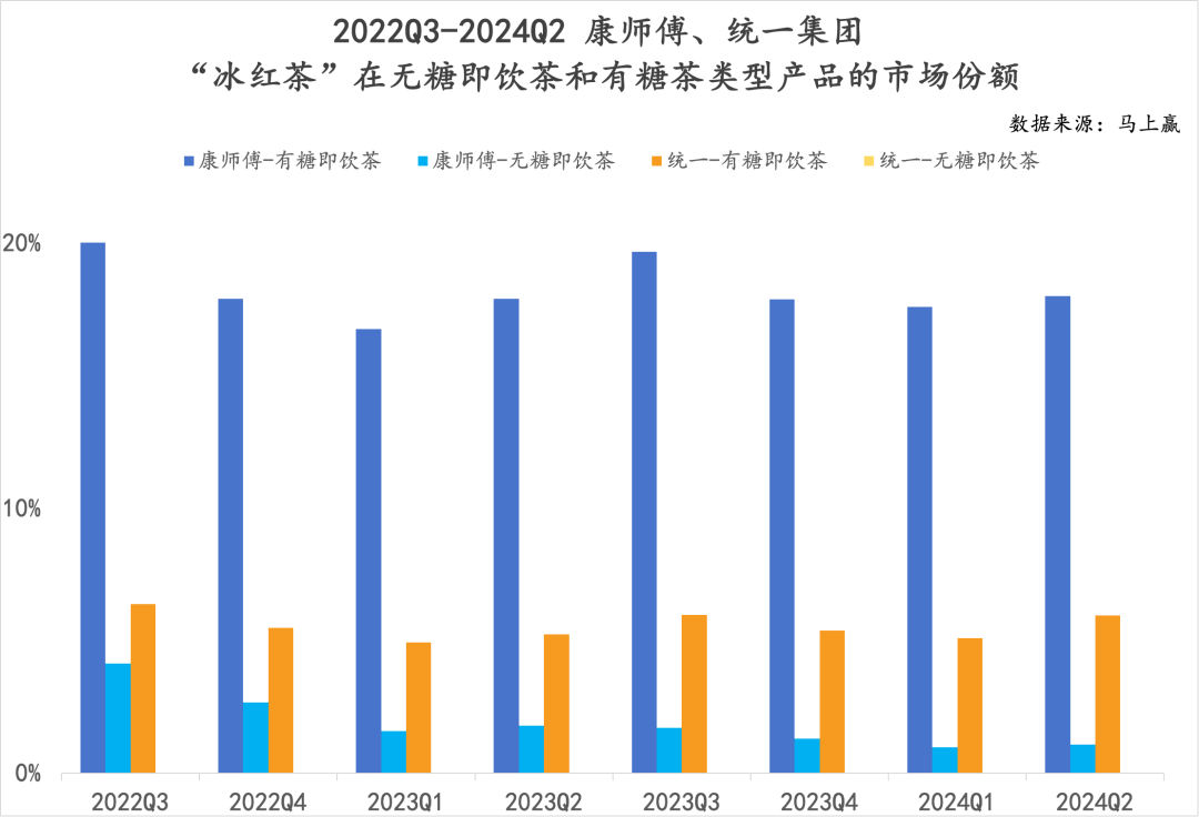 基于马上赢品牌CT中的数据可以看到,对于康师傅、统一两家的当家即饮茶产品“冰红茶”,两家都有推出冰红茶的零糖版本产品。但从市场份额上来看,不论是跟市场上的其他有糖/无糖冰红茶产品对比,还是和自家的有糖冰红茶对比,市场反馈都非常一般。康师傅的零糖版本冰红茶,相较于自己长期领先的有糖冰红茶一直都有很大的差距。且在无糖即饮茶类目快速成长的2022-2024,其零糖版本冰红茶的市场份额还在进一步萎缩。统一则是--虽有零糖版本冰红茶产品,但市场份额几乎不可见。