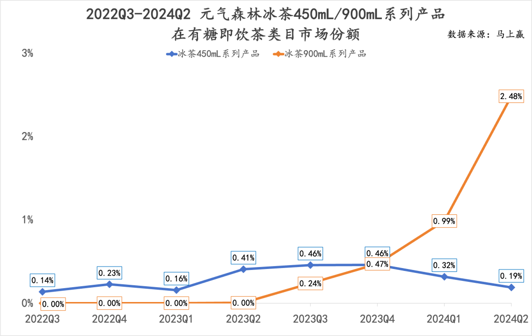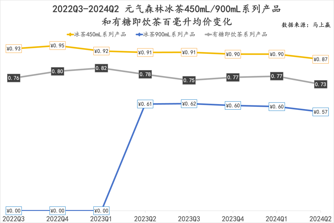 在2022年冰茶产品刚上市时,产品的主推规格为450ml,这也是瓶装饮料中较常见的规格,聚焦单人饮用场景。但在2023年,通过对消费者需求的深度聚焦,元气森林则将冰茶的主推产品规格从450ml改到了900ml,这也为冰茶的“一飞冲天”解决了两个很关键的问题:不够喝、贵。