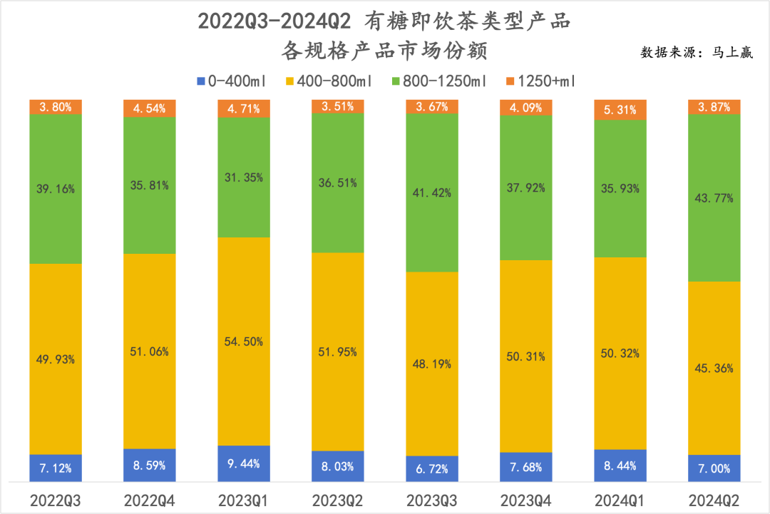 冰茶这一规格上的变化,也与有糖即饮茶类型产品的规格变化趋势亦步亦趋,基于马上赢品牌CT中的数据可以看到,800ml-1250ml这一规格区间在整个类型产品的份额中不断扩大,传统400ml-800ml的常规个人饮用规格则在被挤压。