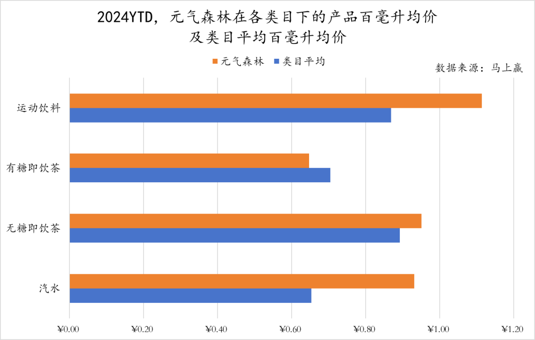 基于马上赢品牌CT中的数据可以看到,在2024年年内至今,元气森林主要产品线(气泡水、电解质水、无糖燃茶、有糖冰茶)所在的类目中,只有冰茶的百毫升均价低于类目百毫升均价的平均水平。高于类目百毫升均价意味着产品比类目平均水平更贵,低于类目百毫升均价则意味着产品比类目平均水平更便宜。