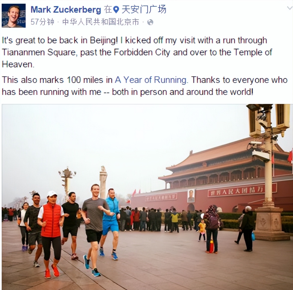 在受到威胁的第二天,扎克伯格依然去跑步,但是身边有了多名保镖。其后他在北京跑步时也是如此。