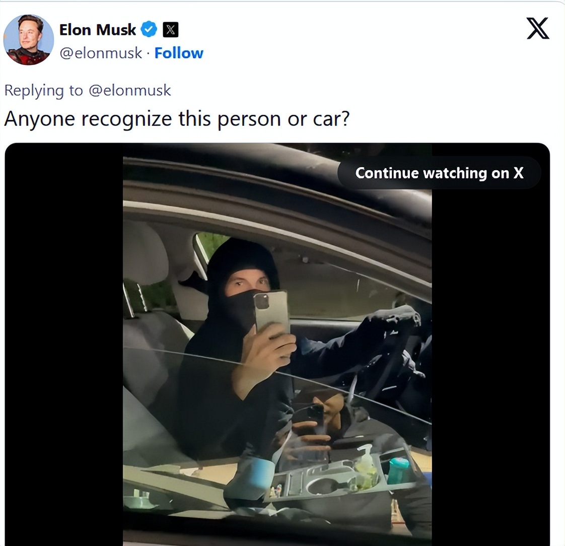 实际上,2022年,马斯克多次公开表示自己遭受死亡威胁,还反复申明绝对不会自杀。而在2022年底,马斯克公布一段视频,视频中一位穿着一身黑衣、戴黑色面罩的陌生男子正在车里举起手机对准马斯克。马斯克声称,一辆载着其儿子的车被这名男子疯狂跟踪,他以为马斯克也在那辆车里。后来他阻挡汽车行驶,并爬上了引擎盖。