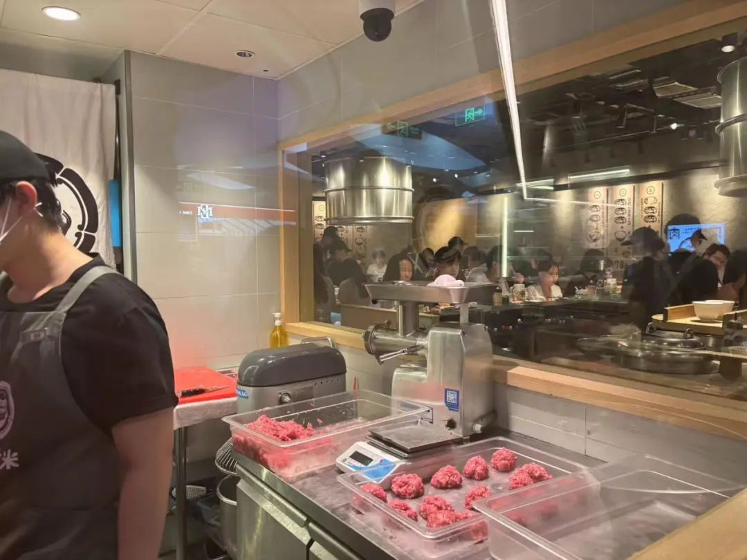 首先是用料上,虽然同样使用牛肉,但是并未标榜食材的来源(有店员称是美牛,但没有其他信息佐证)。门店设立透明的牛肉分切间,设置熟成设备,提升价值感。熟成是一种复杂且昂贵的工艺,通常用于高端牛排店和肉铺。