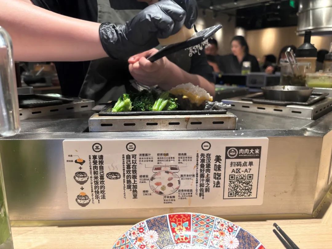 其次是门店设计上挽肉と米是剧场型环形设置,肉肉大米则是而是U形,得以最大限度利用门店面积。烹饪空间分为两部分,一个煎炉和一个添饭和味增汤的台面。在烹饪方式上,用煎而不是烤的工艺,可能和商场内不能用明火有关。