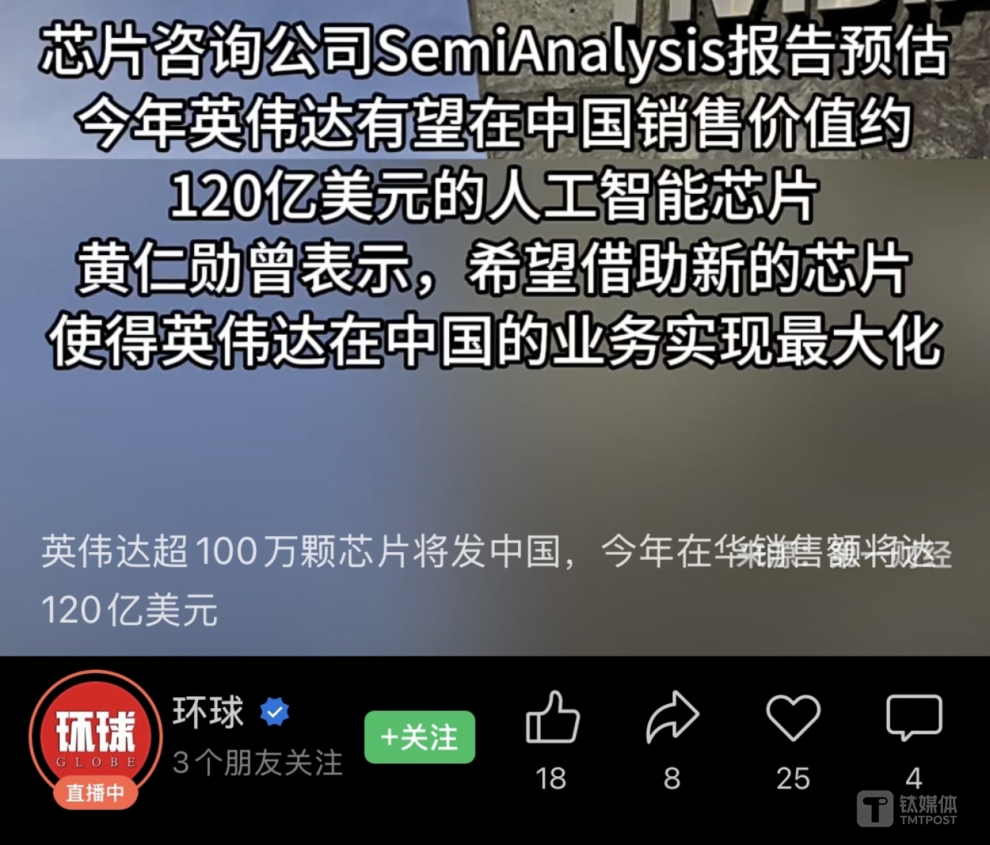 早前新华社主管的《环球》杂志、第一财经等报道称,今年英伟达有望在华交付超过100万颗定制版的H20芯片,每颗H20芯片的价格在12000至13000美元之间,总销售价值约120亿美元。黄仁勋曾表示,希望借助新的芯片使得英伟达在中国的业务实现最大化。
