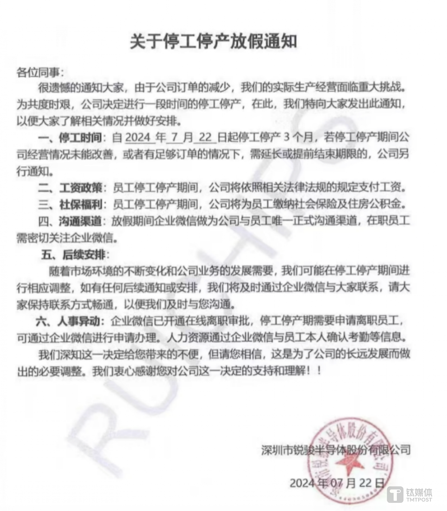 此前,一份关于锐骏半导体的一份《停工停产放假通知》在网上广泛传播。该通知显示,由于公司订单减少,实际生产经营面临重大挑战,公司决定自7月22日起停工停产三个月。