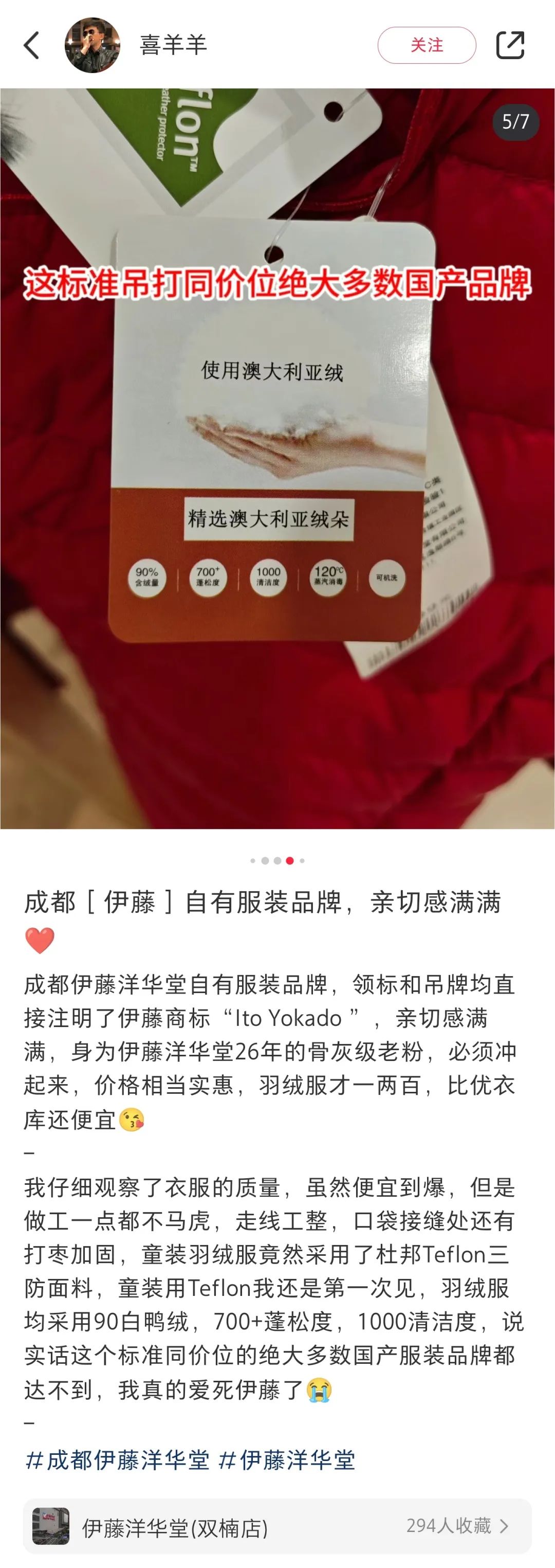 不仅是现制食品,为了满足消费者对食品安全的需求,伊藤多年前就开发了生鲜自有品牌——「看得见的放心」,产品卡上有品种、农药、经过多少轮检测等信息,顾客还可以用手机扫描生产者信息,以了解产品的安全性。伊藤也涉及服装品类的商品开发,有网友晒出购买的羽绒服,价格仅一两百元,白鸭绒含量90%,且蓬松度能做到700+,清洁度1000。