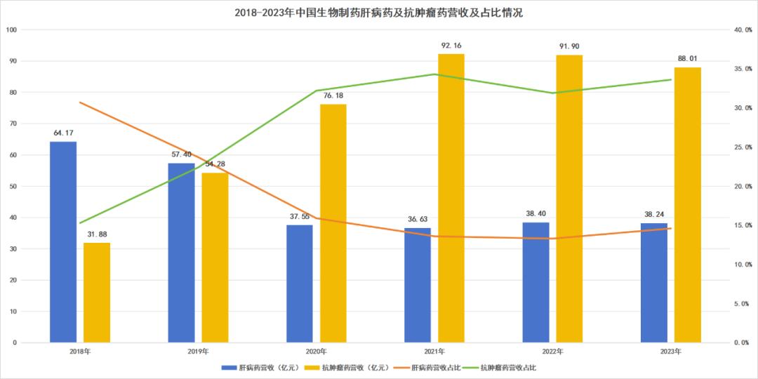 具体来看,中国生物制药肝病药营收不断下降,由2018年的64.17亿元,下降到2023年的38.24亿元,占营收比从30.7%降至14.6%。另一方面,抗肿瘤药迅速发力,从2018年的31.88亿元,增长至2023年的88.01亿元,占比也从15.3%增加至33.6%,完美接替了肝病药物的下降份额。