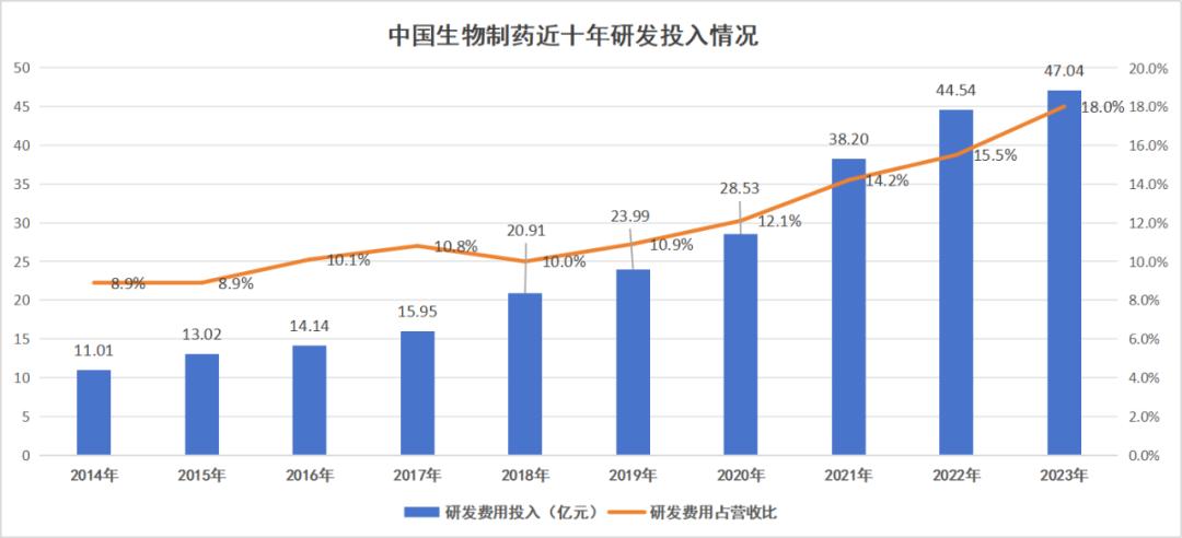 其实,早在安罗替尼上市之前,中生制药就已经开始了转型之路,并把“仿创结合,以仿为主”的口号改为“仿创结合,以创为主”。这点从其不断激增的研发投入上可以窥得一二,2020年开始,其研发投入占比呈明显的上升态势,到2023年,研发投入超过47亿元,占比高达18%。