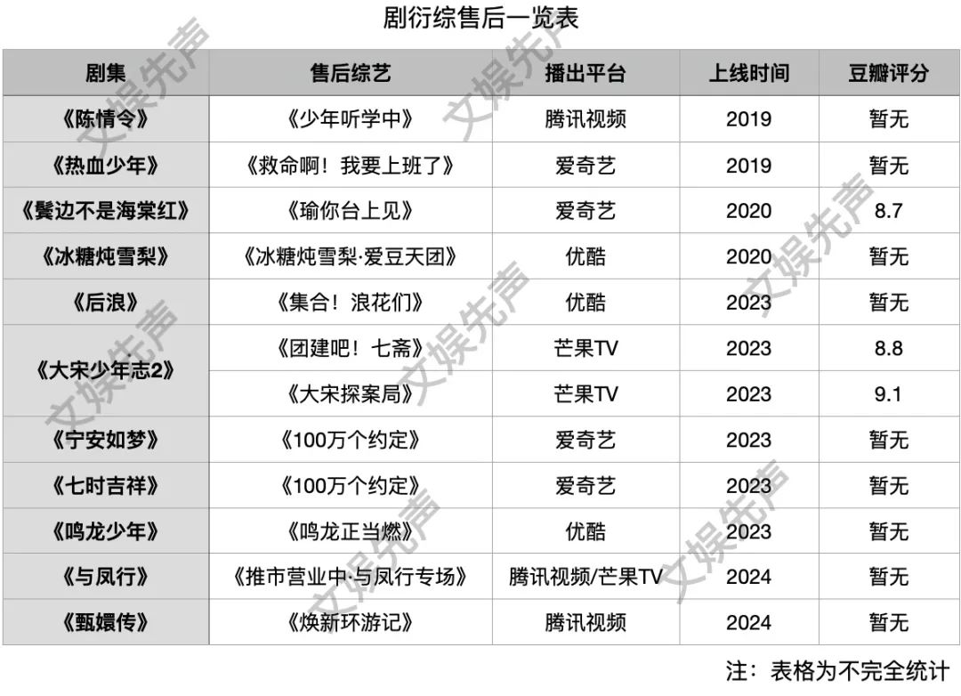 整体来看,爆款剧的售后综艺虽然热度不如剧集,但比起新综艺,仍然有一定的粉丝基础。不过,情怀牌之外,售后综艺仍然需要探索创新玩法,深入挖掘IP衍生价值。
