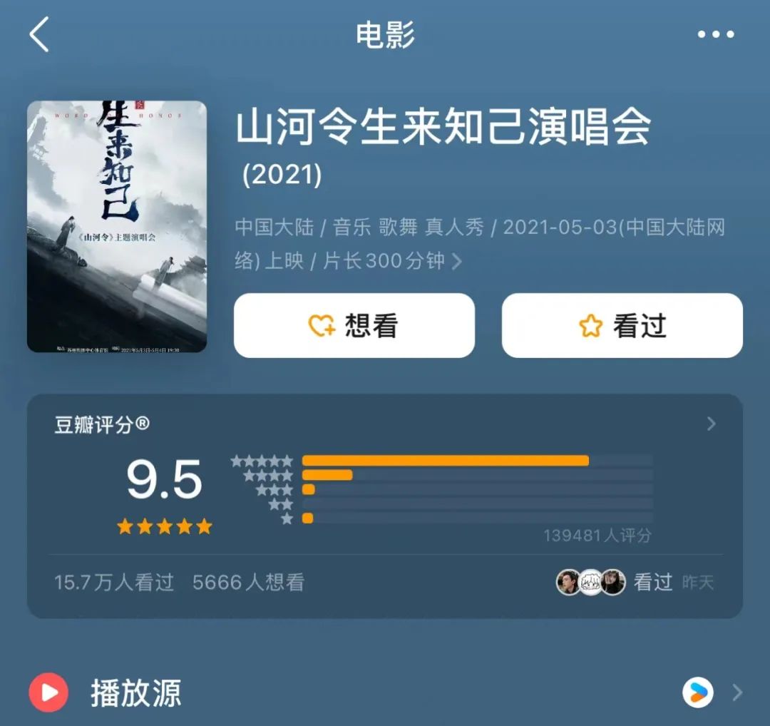 以剧集衍生演唱会为例,爆款耽改剧《山河令》的衍生演唱会《山河令生来知己演唱会》的豆瓣评分高达9.5分,整场演唱会既有主创成员,也有演唱OST的专业歌手,并再现顾湘、曹蔚宁大婚,温客行周子舒晒太阳、集体对抗叶白衣等名场面,着实让各路CP粉成功磕糖,虽然主创集体跑调,但丝毫不影响观感。