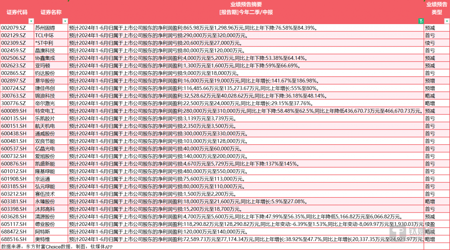值得注意的是,在亏损16家企业中,有14家企业都是首亏,可见今年光伏行业颓势,而在这些企业中,不乏隆基绿能、通威股份、TCL中环、爱旭股份(600732.SH)、双良节能(600481.SH)在内的头部企业,其5家今年上半年预亏上限均超过10亿元。