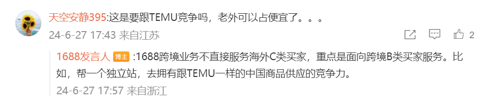需要指出的是,作为汇集众多源头厂商的 B2B 电商,1688 的跨境业务与当前诸多出海平台的主攻方向不同,如其官方微博所言,“1688 跨境业务不直接服务海外 C 类买家,重点是面向跨境 B 类买家,比如帮一个独立站拥有跟 Temu 一样的中国商品供应的竞争力。”