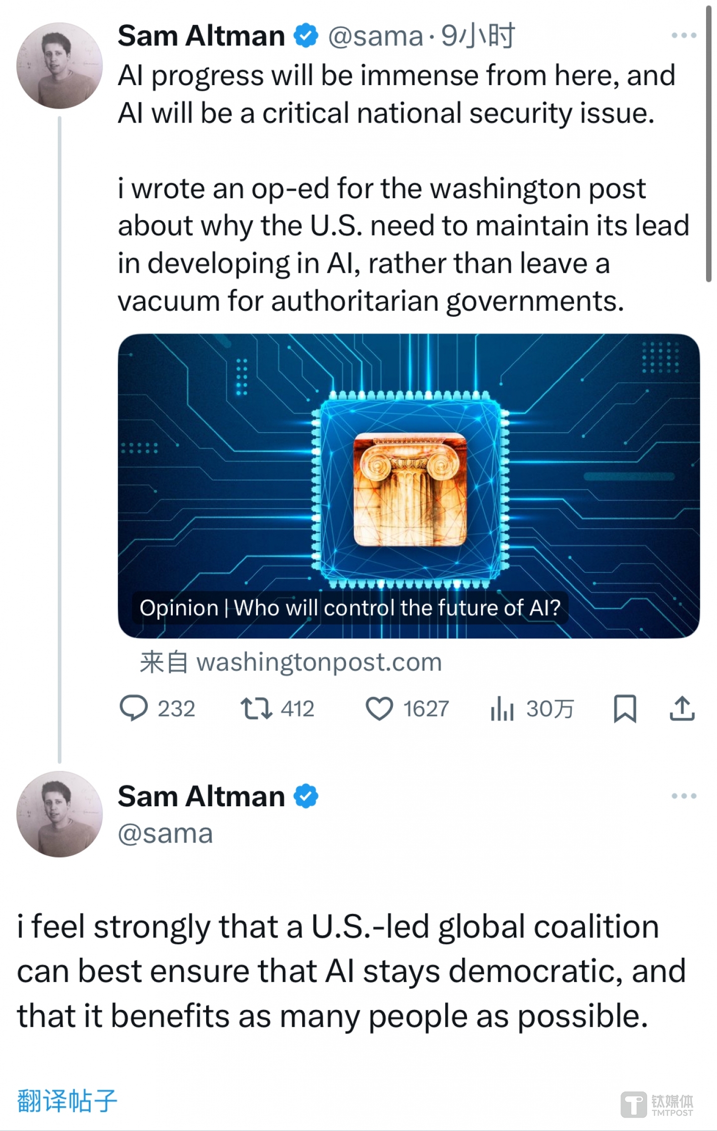 “我强烈地感觉到,以美国为首的全球联盟最能确保AI保持民主,并让尽可能多的人受益。”奥尔特曼在推文表示。