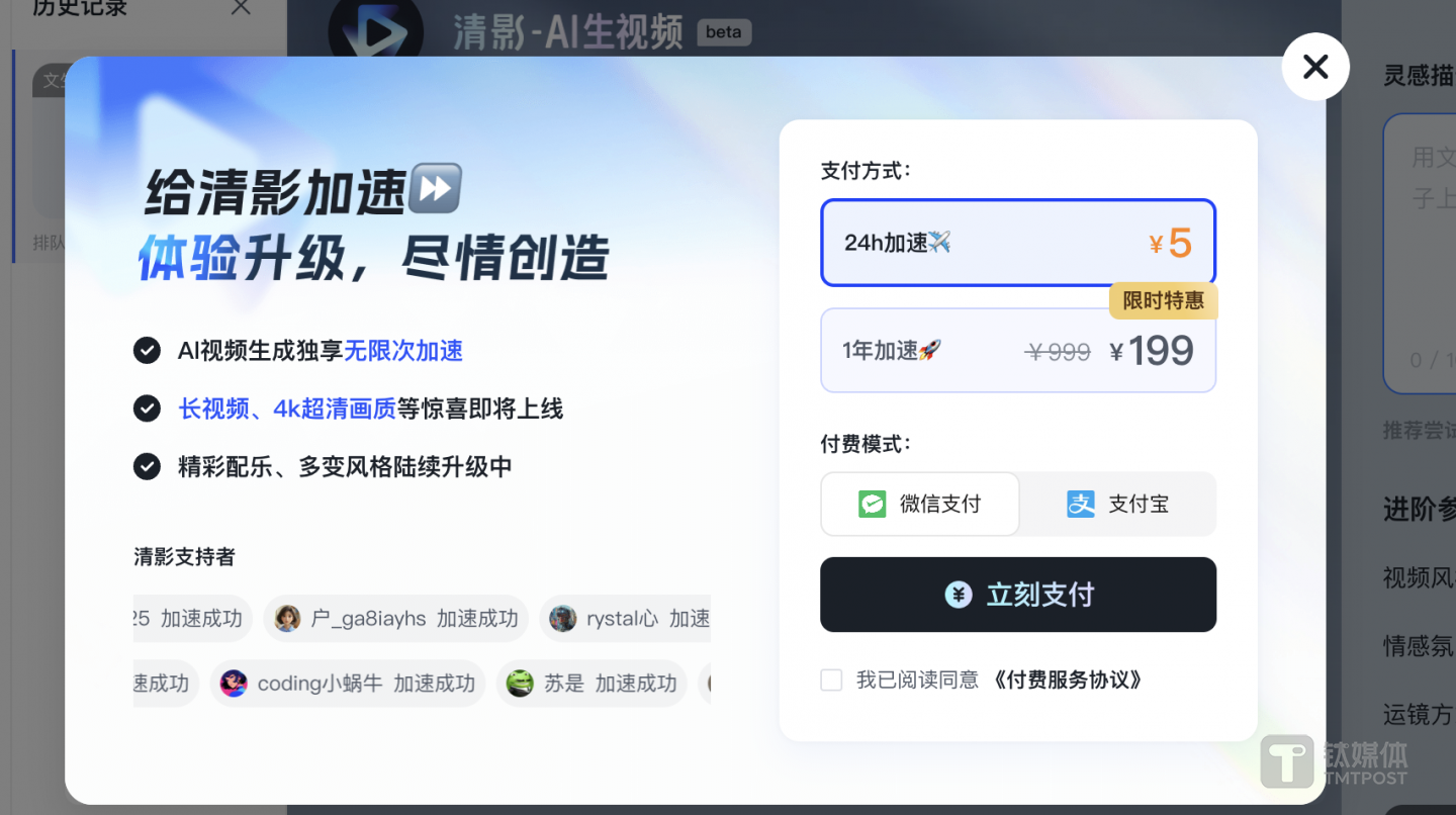 谈到 AI 视频生成的商业化,张鹏表示,目前智谱清影的商业化还处于早期,更多是通过API进行付费。