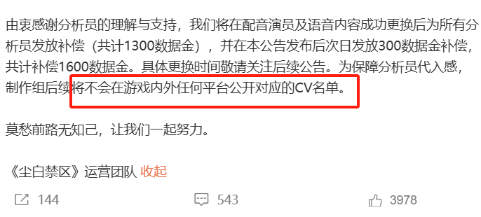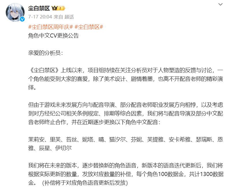 还没来得及开香槟,新的危机又笼罩在《尘白禁区》头上。7月17日晚间,官方发长文表示因游戏发展方向与部分配音老师职业规划相悖,所以将陆续终止与配音老师们的合作,并逐步更换这些角色的中文配音。