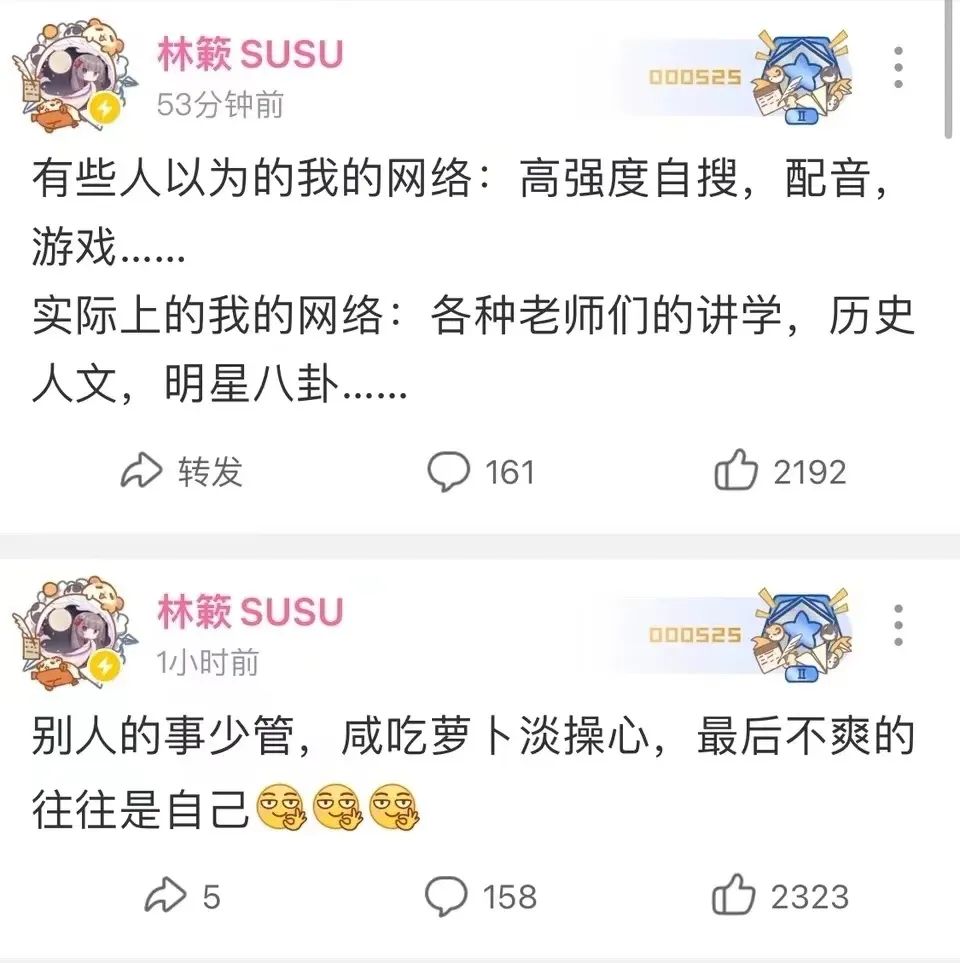 女CV当然也有“塌房”的,比如杜冥鸦指用小号追星过于放飞自我,还有人在群聊爆料她现实中的一面等等,虽然杜冥鸦通过法律武器维权并胜诉,但仍有不少瓜只吃一半的网友把恶意爆料当做“实锤”;奇响天外另一位重要人物林簌,则总被指给自己人塞资源等等。